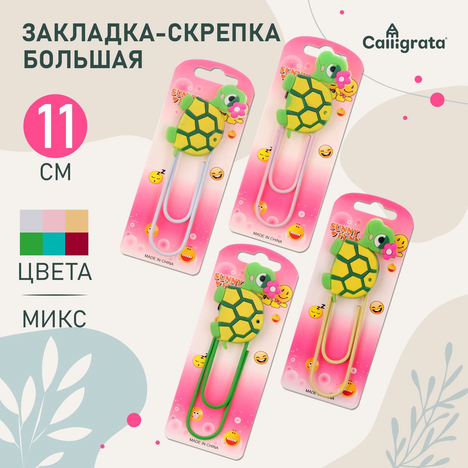 Закладка-скрепка большая, 11 см, "Черепашка", МИКС, 1x5.5x14 см., Calligrata, Китай