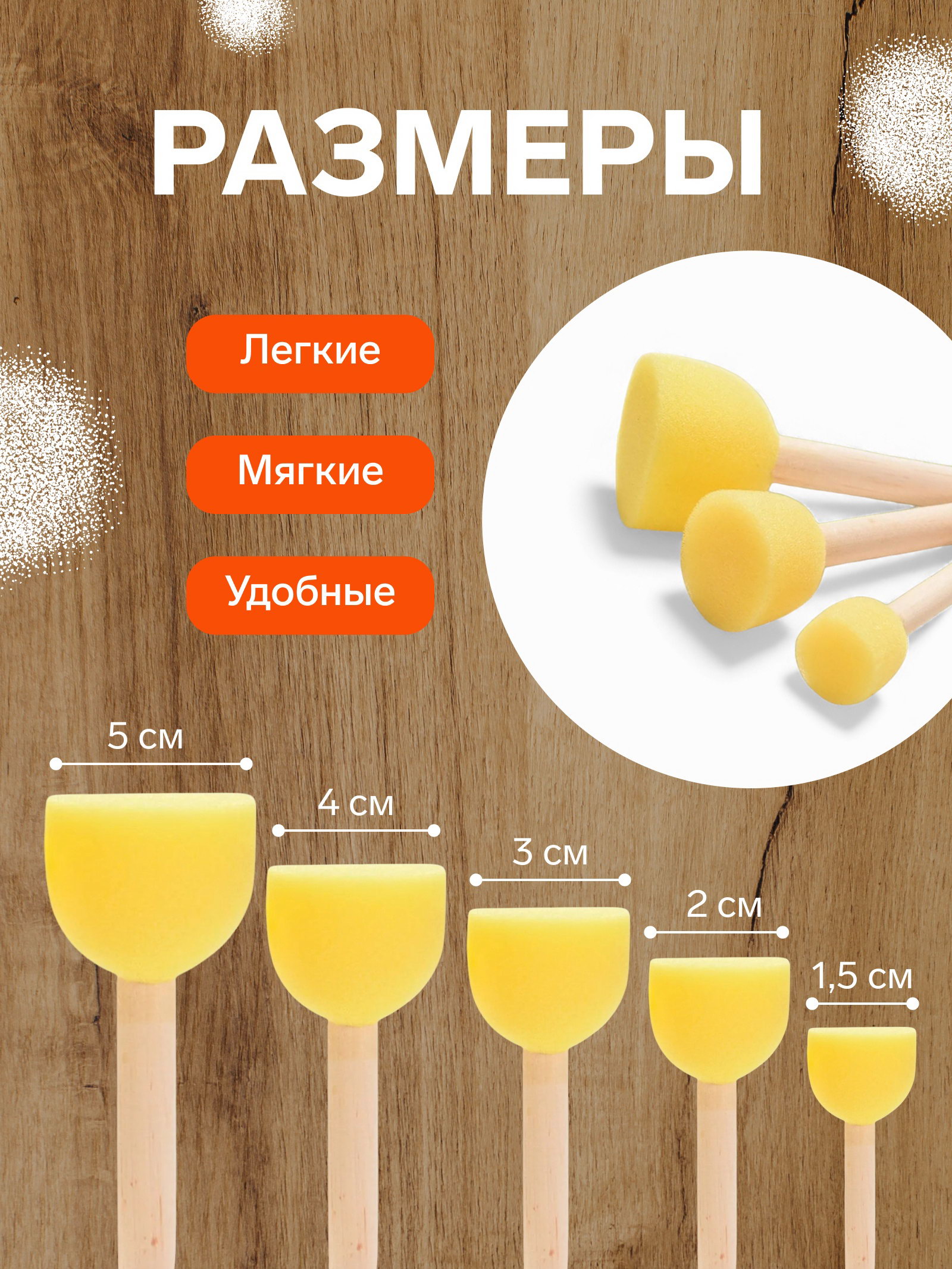 Размер упаковки: 12 x 5 x 14 см. Форма кисти: Трафаретная Вид упаковки: Блистер Набор: Да В наборе, шт.: 5 Материал ворса кисти: Поролон tnved: 9603301000 Вид кисти: Школьная Цвет ручки: Бежевый Вид: Губка Европодвес: Да Штрихкод на единице товара: Да Материал ручки: Дерево ![]() Поролоновые кисти-спонжи подойдут для нанесения краски на большие поверхности рисунка и создания интересных текстур. У кисти есть ручка, поэтому работать вы сможете аккуратно, не пачкая руки. Диаметры спонжей: