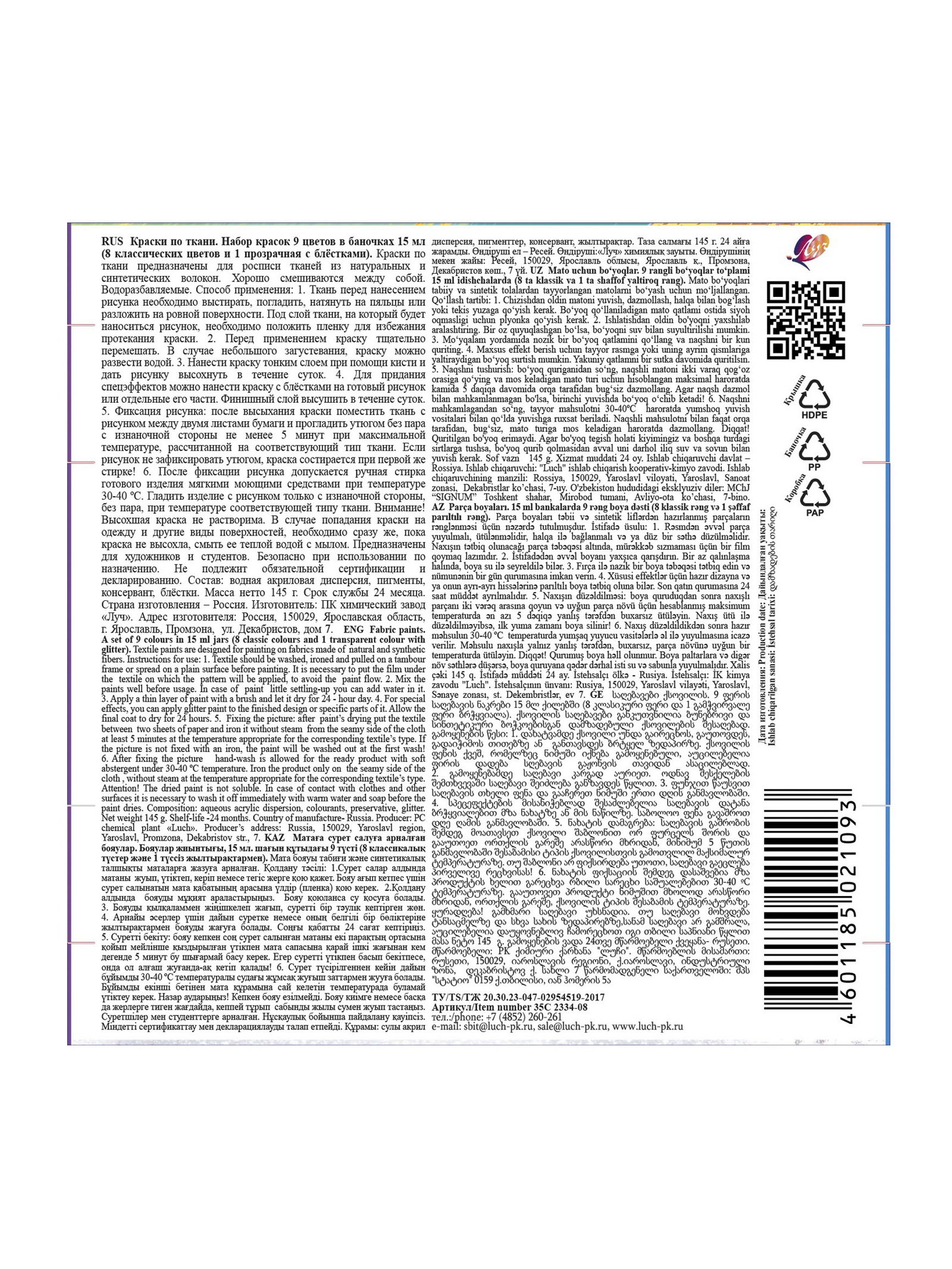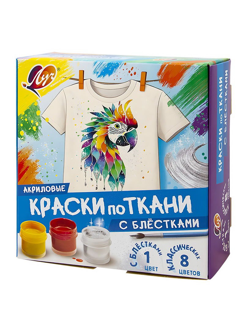 Краска по ткани акриловые, набор 9 цветов * 15 мл, с блёстками + классические, 15 мл., Луч, Россия