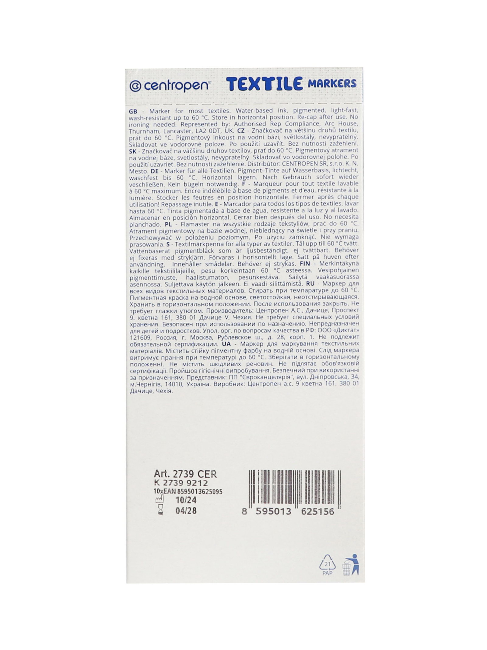 Особенности: Без особенностей, По ткани Размер упаковки: 1.2 x 13.5 x 1.2 см. Особенности цвета: Однотонный Тип наконечника: Пулевидный Цвет: Чёрный Назначение: Для ткани Тип: Водный Колпачок у фломастера: Вентилируемый tnved: 9608200000 Количество цветов: 1 Штрихкод на единице товара: Да Диаметр пишущего узла, мм: 3.9 Вид упаковки: Коробка картонная Вид: Для творчества Набор: Нет Европодвес: Нет Температурное ограничение транспортировки: Нет Centropen 2739 это маркер-фломастер для текстиля (ткани) с эргономичной зоной обхвата. Основные характеристики: