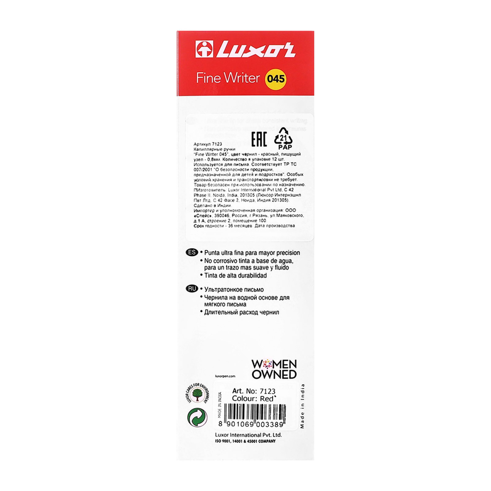Размер упаковки: 0.7 x 0.7 x 17 см. Диаметр пишущего узла, мм: 0.8 Набор: Нет Вид ручки: Капиллярная Цвет стержня: Красный Тип: Для школы и офиса Особенности ручек: Без особенностей Реестр Минпромторга: Нет Тип наконечника: Клиновидный Наличие грипа: Нет Наличие грипа: Нет tnved: 9608101000 Особенности цвета: Без особенностей Количество цветов: 1 Штрихкод на единице товара: Да Европодвес: Нет Температурное ограничение транспортировки: Да Капиллярная ручка Luxor Fine Writer - линер, тонкопишущий фломастер и чертежный инструмент одновременно. Красная ручка подходит для письма на бумаге, черчения, эскизов, рисунков в скетчбуке и рисунков на крафтовой бумаге, прорисовывания мелких элементов. Особенность капиллярных ручек - это умение подстраиваться под силу нажима, из-за чего напряжение на руку при письме не ощущается. Luxor Fine Writer пишут очень тонкой равномерной линией, оставляя четкий и достаточно контрастный след. Наконечник изготавливается из твёрдого пластика, благодаря чему обеспечивается одинаковая толщина линий при разных наклонах ручки, линия остается тонкой и ровной при длительном письме. Светостойкие чернила на водной основе не выцветают под воздействием солнечных лучей и легко отстирываются с одежды. Капиллярные ручки Luxor до 7 дней не высыхает без колпачка, а при закрытом колпачке в течение 10 часов полностью восстанавливают свои свойства! Чернила мгновенно высыхают на бумаге, поэтому надписи и рисунки не размазываются. Цвет чернил - красный, диаметр пишущего узла - 0,8 мм Упаковка: картонная коробка по 12 штук. Рисуй ярко и пиши мягко вместе с капиллярными ручками Luxor. Характеристики