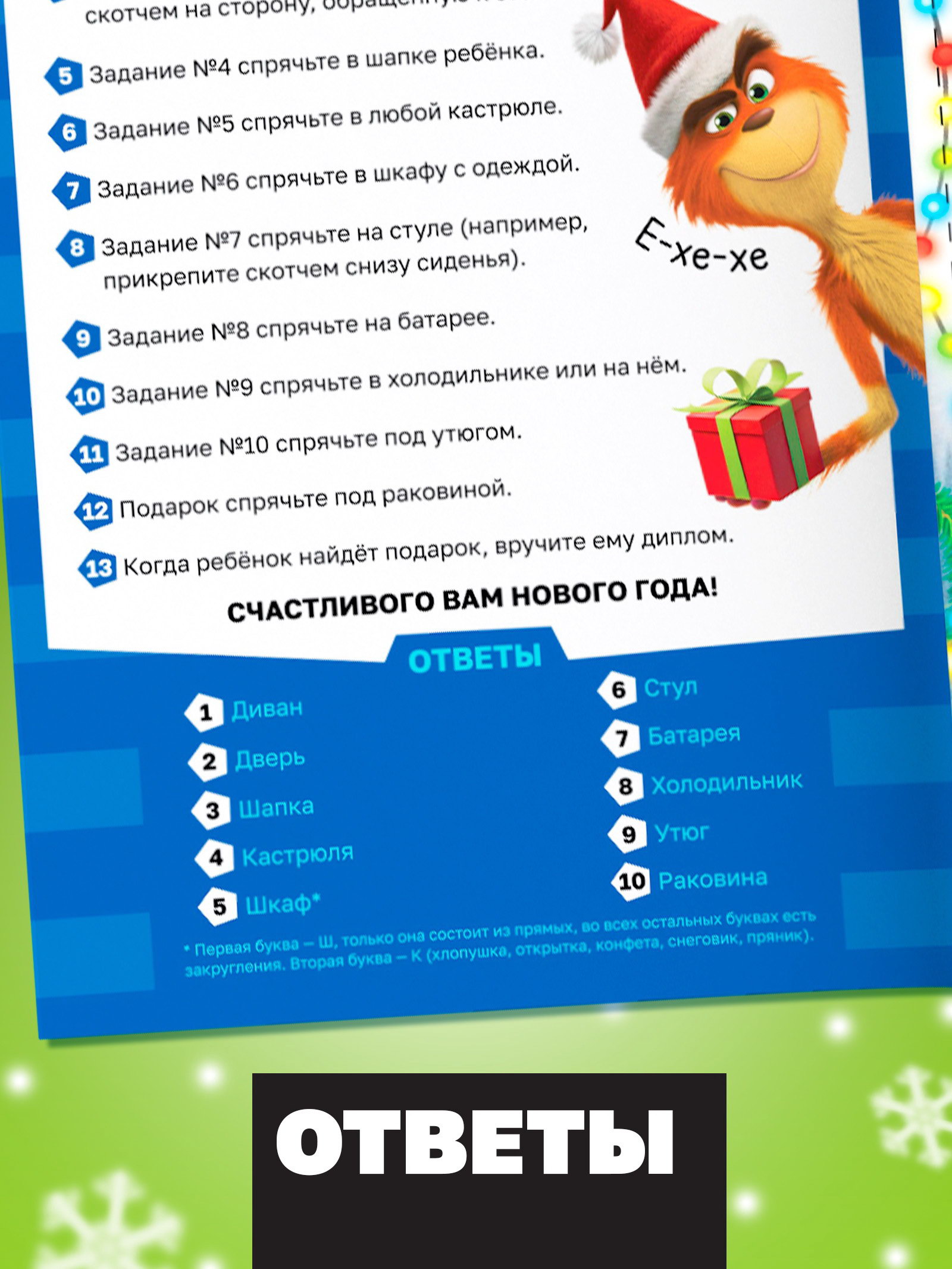 Игра с пользой для развития Этот квест не просто развлекает, но и развивает важные навыки. Задания направлены на тренировку логики, внимательности и способности мыслить нестандартно. Каждая разгаданная загадка это шаг ближе к разрешению новогодней тайны, словно участник оказывается в роли героя из любимого детективного фильма. Увлекательный сюжет и яркие иллюстрации поддерживают интерес до самого финала. Книга-квест станет отличным помощником для родителей, педагогов или организаторов праздников. Она идеально подходит для создания атмосферы веселья и загадочности как дома, так и в школе или на новогоднем мероприятии. Выбирая этот квест, вы дарите ребёнку не только увлекательное занятие, но и возможность гордиться своими достижениями. Ведь каждое выполненное задание это маленькая победа, которая делает праздник ещё более особенным! | ||