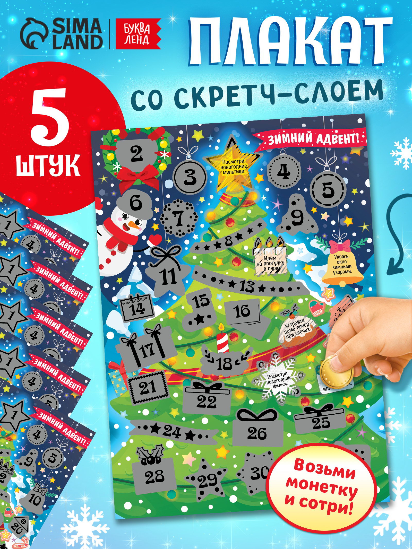 Плакат со скретч - слоем "Зимний адвент", набор 5 шт., БУКВА-ЛЕНД, Китай