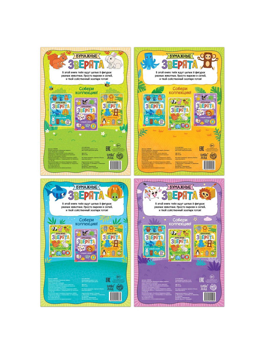 Книжки - вырезалки "Бумажные зверята", набор 4 шт. по 20 стр., А4, 0.5x29.5x21 см., БУКВА-ЛЕНД, Россия