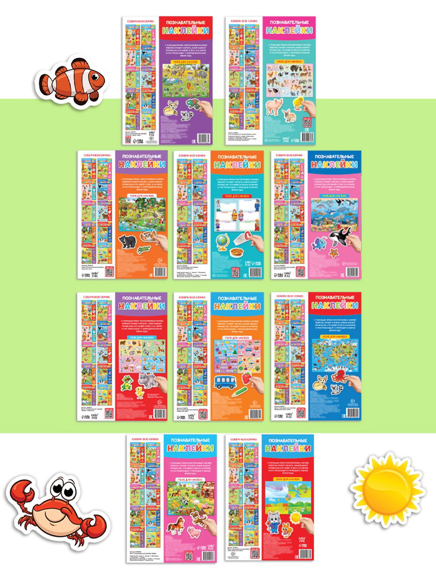 Книги с наклейками многоразовыми "Познавательные", набор 10 шт., 0.5x28.5x21 см., БУКВА-ЛЕНД, Китай