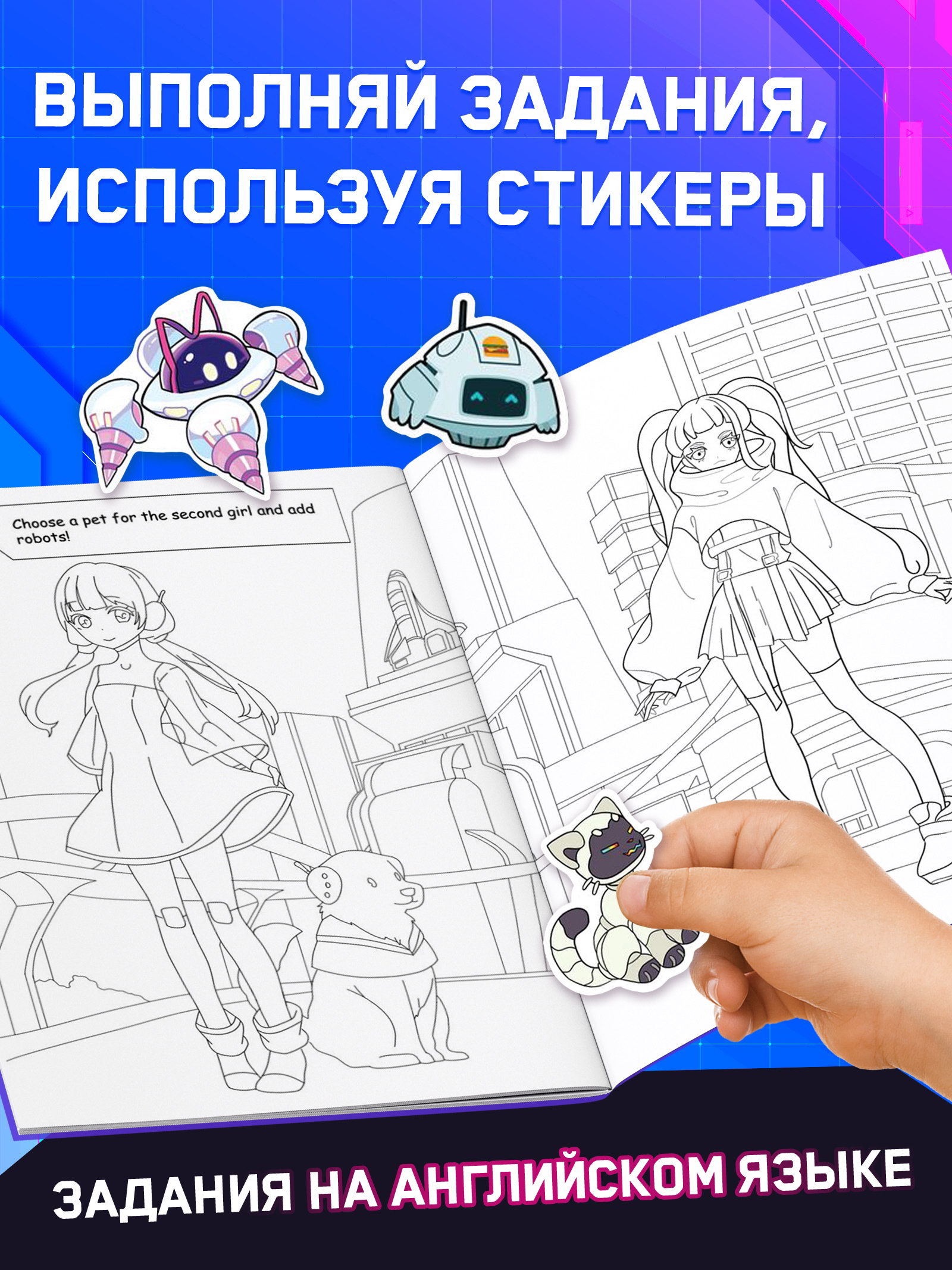 Раскраска с заданиями CYBER anime, на английском языке, 50 наклеек, БУКВА-ЛЕНД, Китай