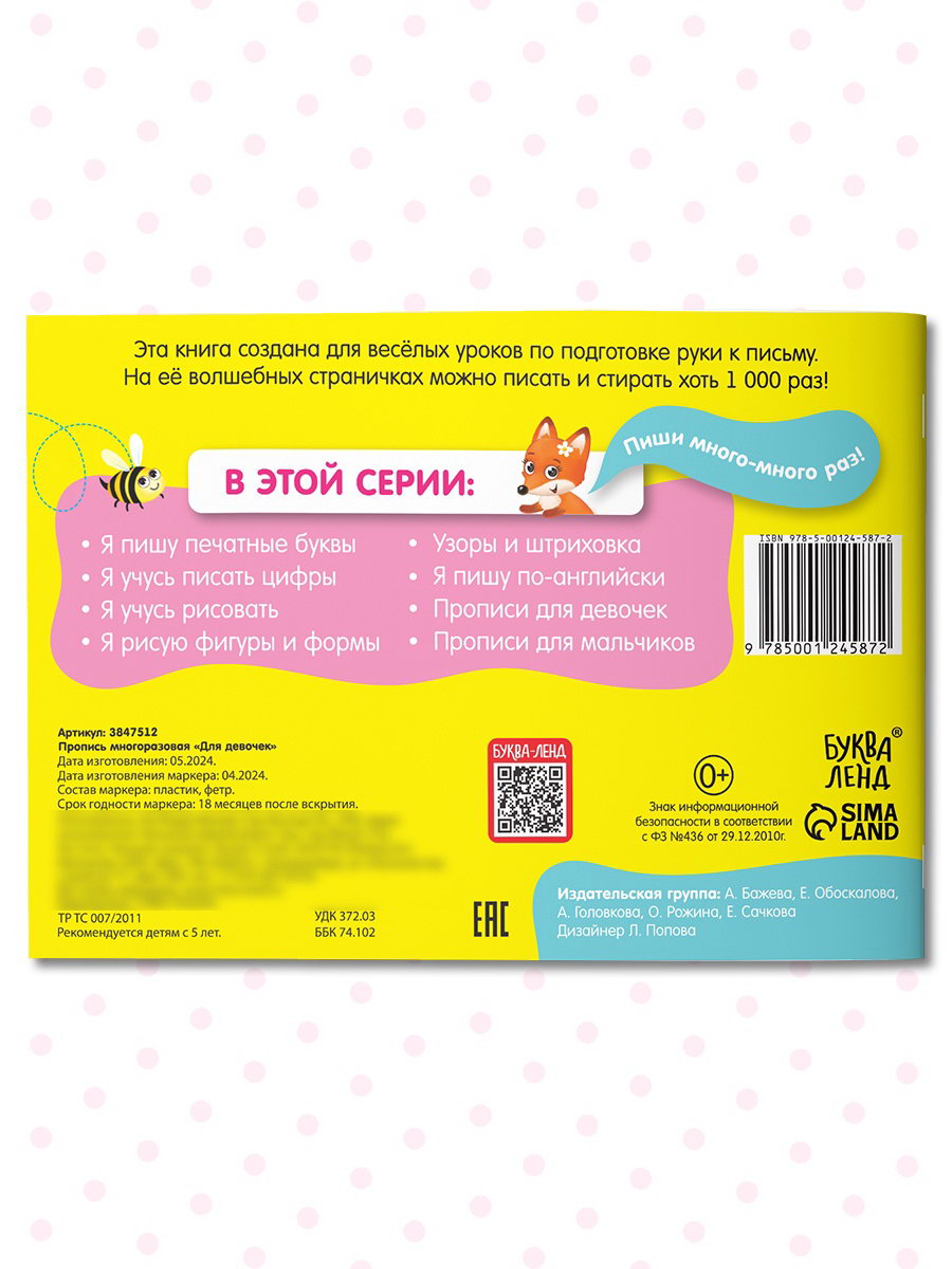 Развитие навыков: Внимание, Логика, Моторика Линовка блока: Без линовки, Клетка Вид: Настольно-печатные, Прописи Возраст: Детский, Для детей, От 3 лет Вид раскраски: Многоразовые, С заданиями Размер упаковки: 1.5 x 12.5 x 17.5 см. Автор: Коллектив авторов Год издания: 2023 Формат: А5- Для кого: Для девочки tnved: 4903000000 Язык издания: Русский Количество страниц: 12 Набор: Нет Тема обучения: Цвета, формы, звуки Тематика праздника: 8 Марта Тип обложки: Мягкий переплёт Многоразовая пропись "Пиши-стирай. Прописи для девочек" отличный способ для ребёнка освоить навыки письма в увлекательной форме. В комплекте 12 страниц с заданиями и специальный маркер, который позволяет многократно стирать написанное и начинать заново. Это отличное решение для малышей, которые только начинают учиться писать. Преимущества