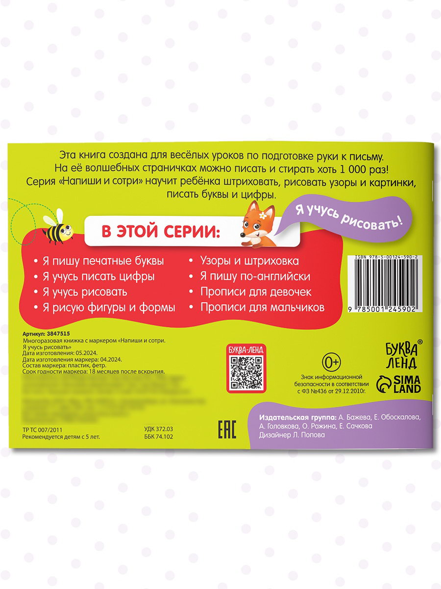 Пропись многоразовая "Я учусь рисовать", 12 стр., с маркером, 1.5x17.5x12 см., БУКВА-ЛЕНД, Китай