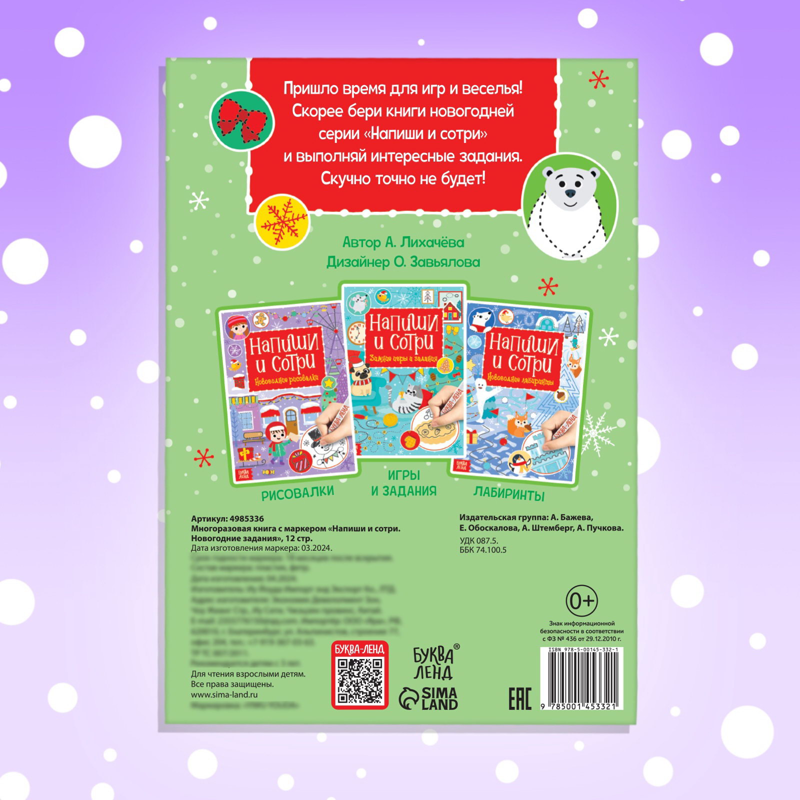 Книга с маркером "Напиши и сотри. Новогодние задания", 12 стр., многоразовая, 1x24x17 см., БУКВА-ЛЕНД, Китай
