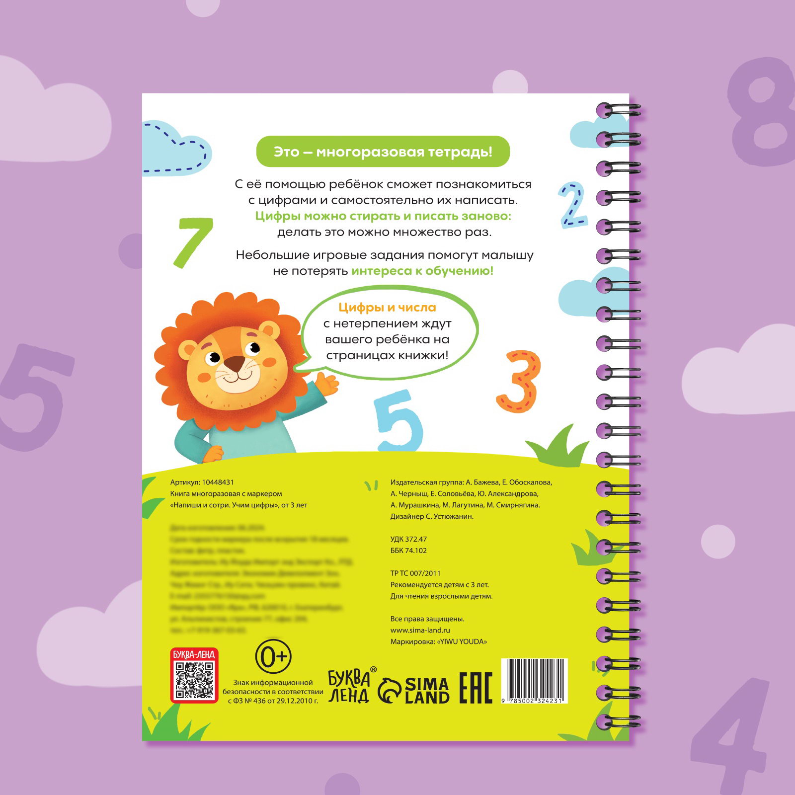 Возраст: Детский, Для детей, От 3 лет Тема обучения: Развитие моторики, Цифры, счёт, математика Вид раскраски: Многоразовые, С заданиями Развитие навыков: Буквы, цифры, Логика, Моторика Размер упаковки: 1 x 30 x 25 см. Набор: Нет Количество страниц: 36 Вид: Тесты и задания Автор: Коллектив авторов Год издания: 2024 Тип обложки: Интегральный переплёт Тематика: Подготовка к школе Формат: А4 Язык издания: Русский tnved: 4903000000 tnved: 4903000000 Многоразовая развивающая тетрадь поможет малышу изучать цифры и тренироваться столько раз, сколько ему понадобится для успешного закрепления полученных знаний. Книга идеально подойдёт малышам от 3 лет, которые только начинают изучать цифры написанное легко стирается, чтобы можно было тренироваться вновь и вновь. Характеристики