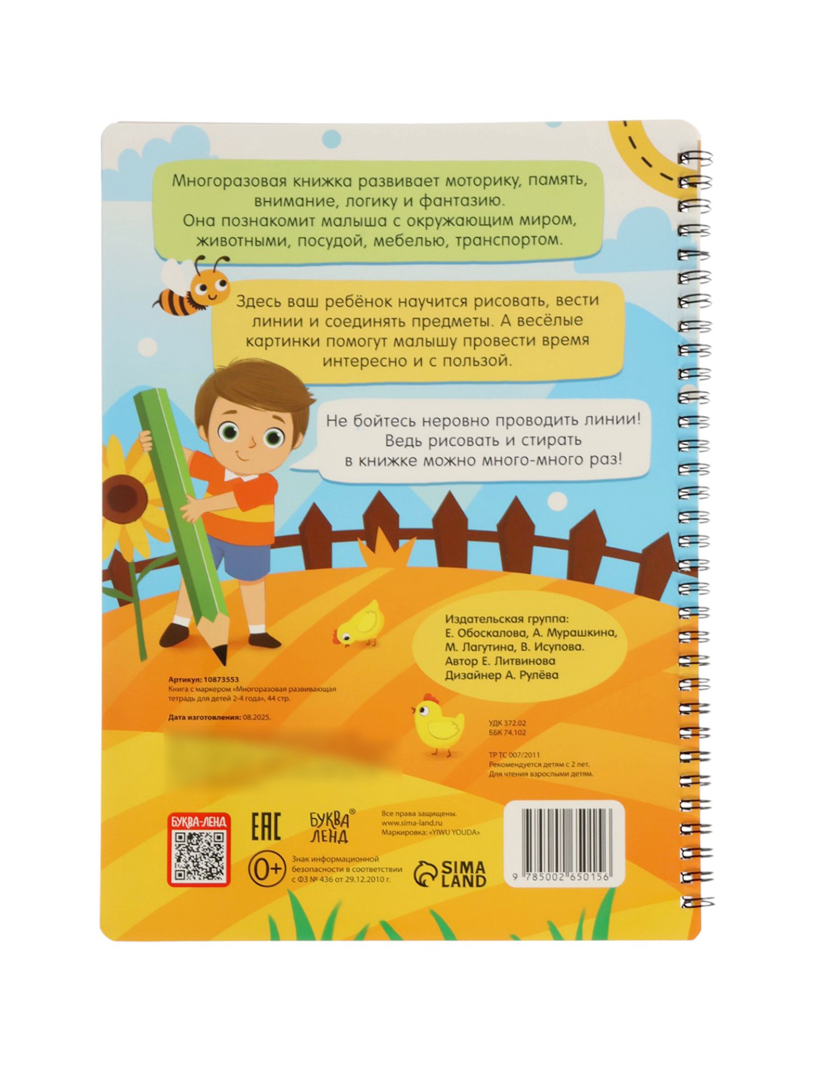 Книга с маркером "Многоразовая развивающая тетрадь", 2-4 года, 44 стр., 21x1.5x29.7 см., БУКВА-ЛЕНД, Китай