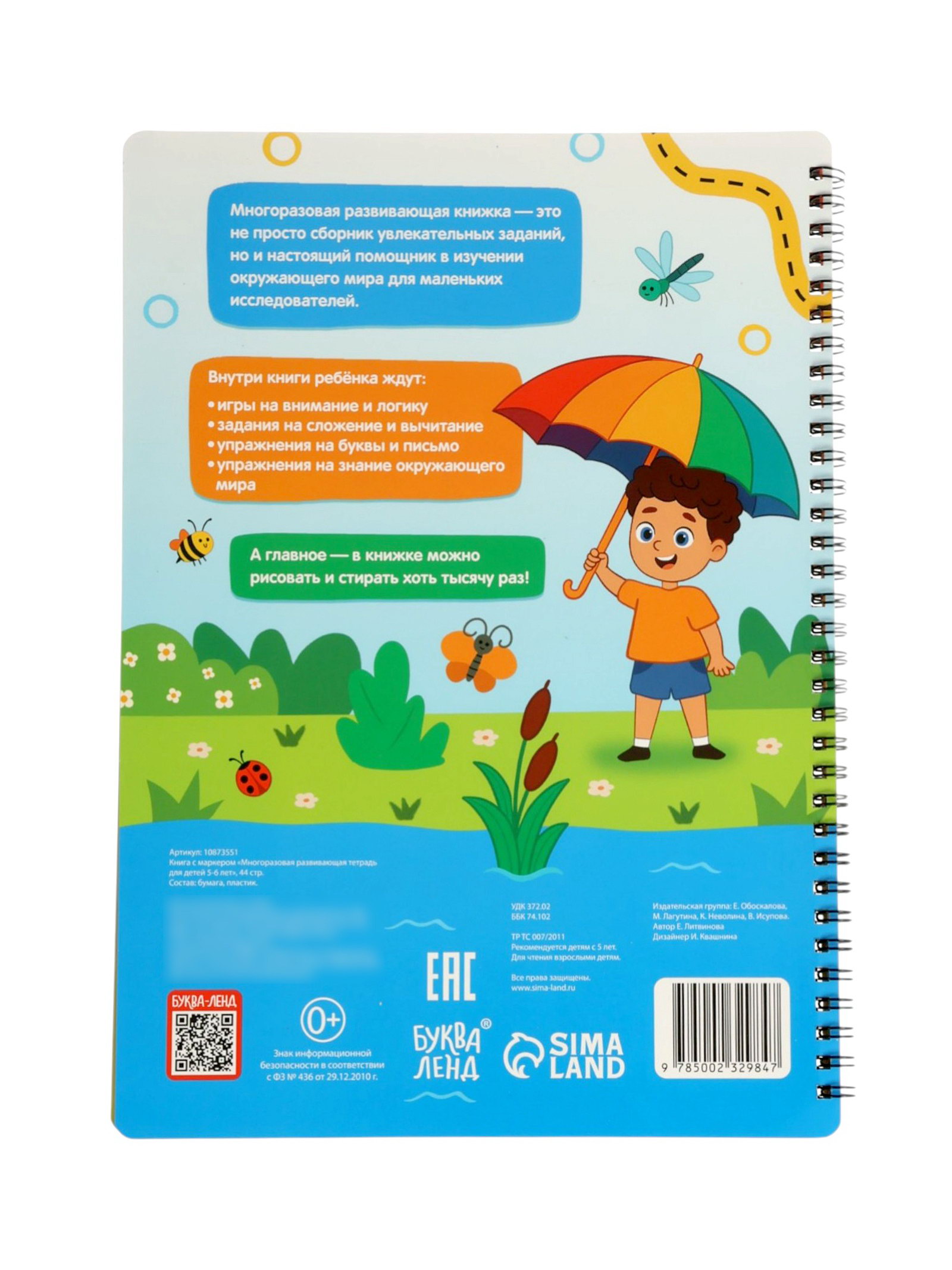 Книга с маркером "Многоразовая развивающая тетрадь для детей 5-6 лет", 44 стр., 21x1.5x29.7 см., БУКВА-ЛЕНД, Китай