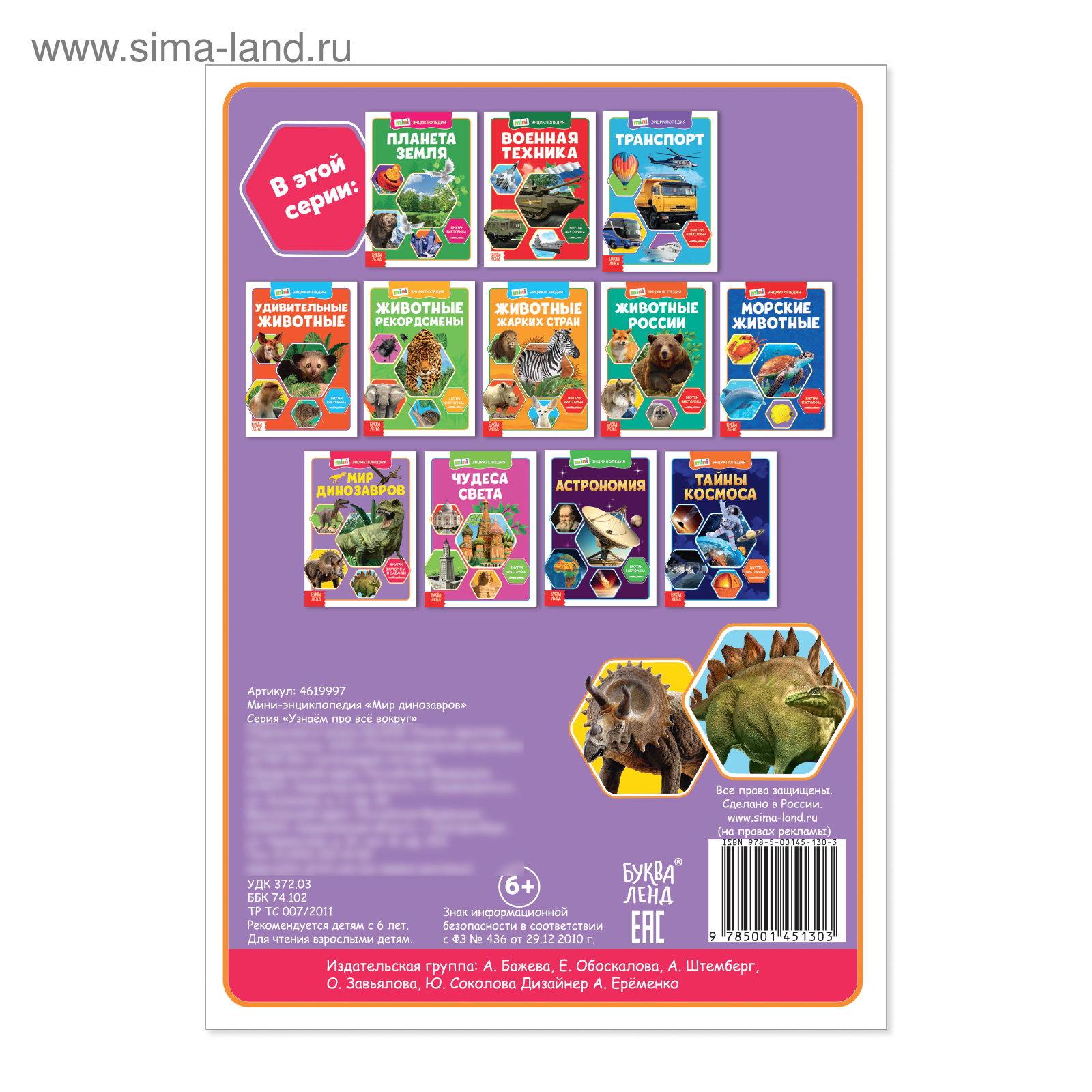 Вид: Обучающие книги, Энциклопедия Возраст: Для детей, От 6 лет tnved: 4901990000 tnved: 4901990000 Формат: А5- Температурное ограничение: Нет Вид книги: Обучающие книги Тематика: Динозавры Количество страниц: 20 Тема энциклопедии: Динозавры Автор: Соколова Юлия Сергеевна Тип обложки: Мягкий переплёт Тема обучения: История Набор: Нет Мини-энциклопедия "Мир динозавров" лучший подарок для маленького археолога. Она познакомит ребёнка с доисторическими ящерами: стегозавром, спинозавром, диплодоком, паразауролофом и многими другими. Малыш узнает об их особенностях, образе жизни и удивит этими фактами друзей. Книга интересна для детей и родителей. В неё включены задания на проверку знаний и развлекательная викторина. Издание удобно брать с собой, чтобы изучать вместе с друзьями и близкими. Рекомендовано детям с 6 лет. | ||