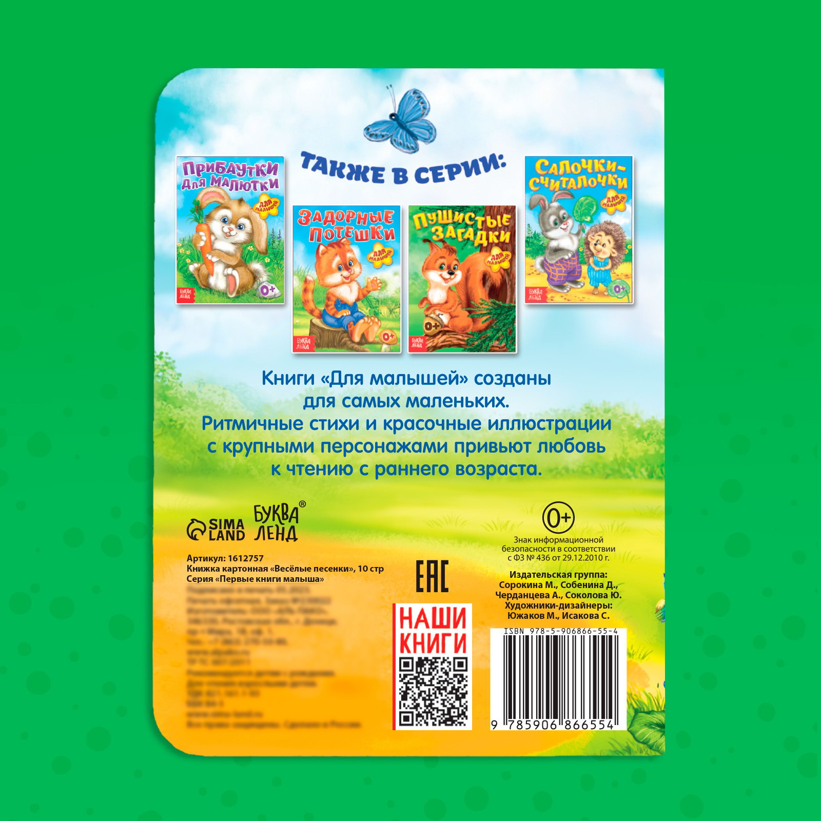Возраст: Для детей, От 0 месяцев Размер упаковки: 0.5 x 15 x 11 см. Тип: Классическая Язык издания: Русский Автор: Народное творчество tnved: 4903000000 Формат: А6+ Количество страниц: 10 Набор: Нет Книжка-картонка "Весёлые песенки" это первое знакомство ребёнка с миром музыки и рифм. Прочные картонные страницы и яркие иллюстрации делают её идеальным выбором для детей от 0 месяцев. Особенности