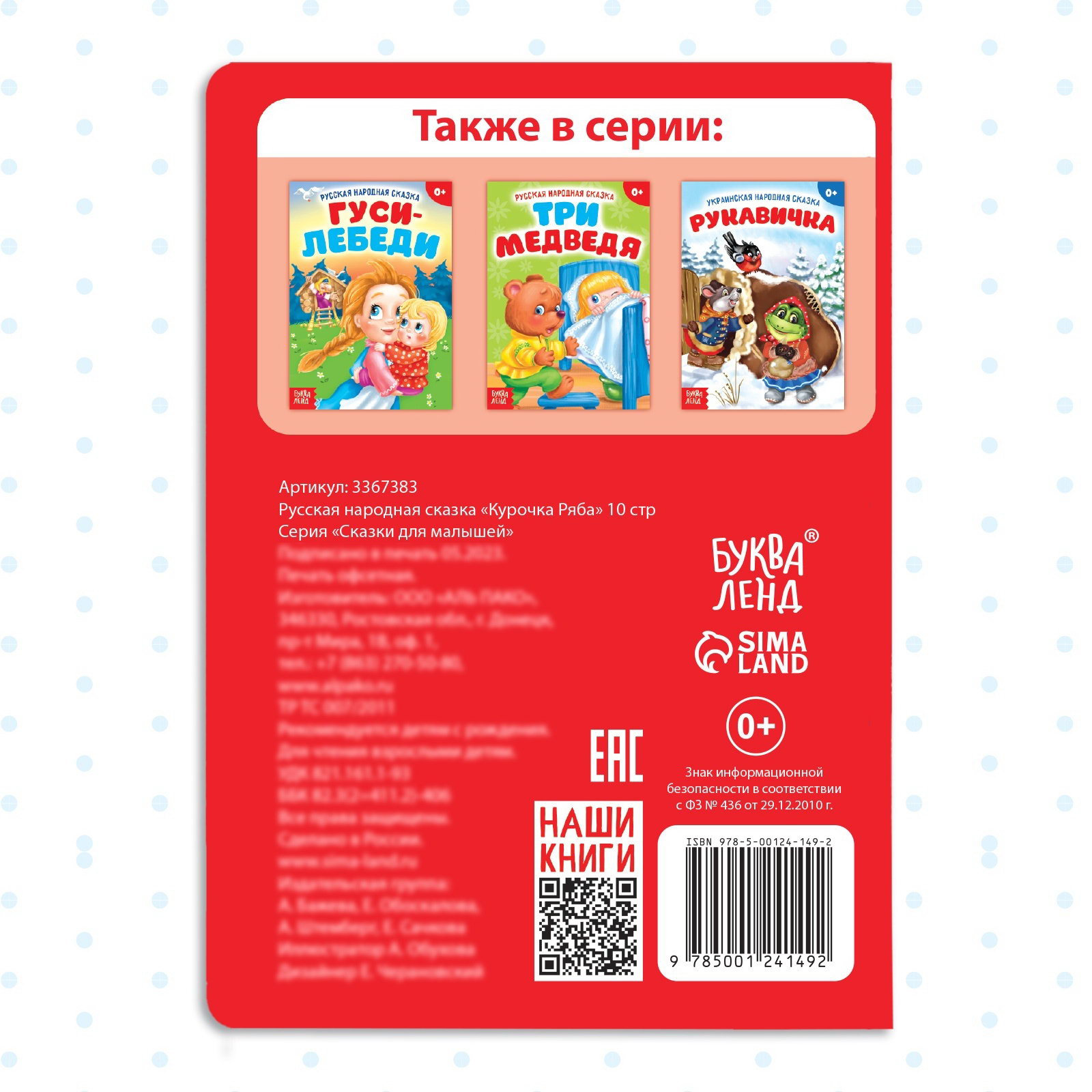 Книга идеально подходит для детей от 3 лет. Твёрдый переплёт и безопасные материалы делают её удобной для маленьких ручек, а простой текст и яркие картинки помогают развивать внимание и воображение с первых месяцев жизни. Чтение сказки "Курочка Ряба" помогает малышу знакомиться с миром через яркие образы и простые сюжеты. Книга способствует развитию речи, памяти и эмоционального интеллекта, а также формирует первые представления о добре и зле. | ||