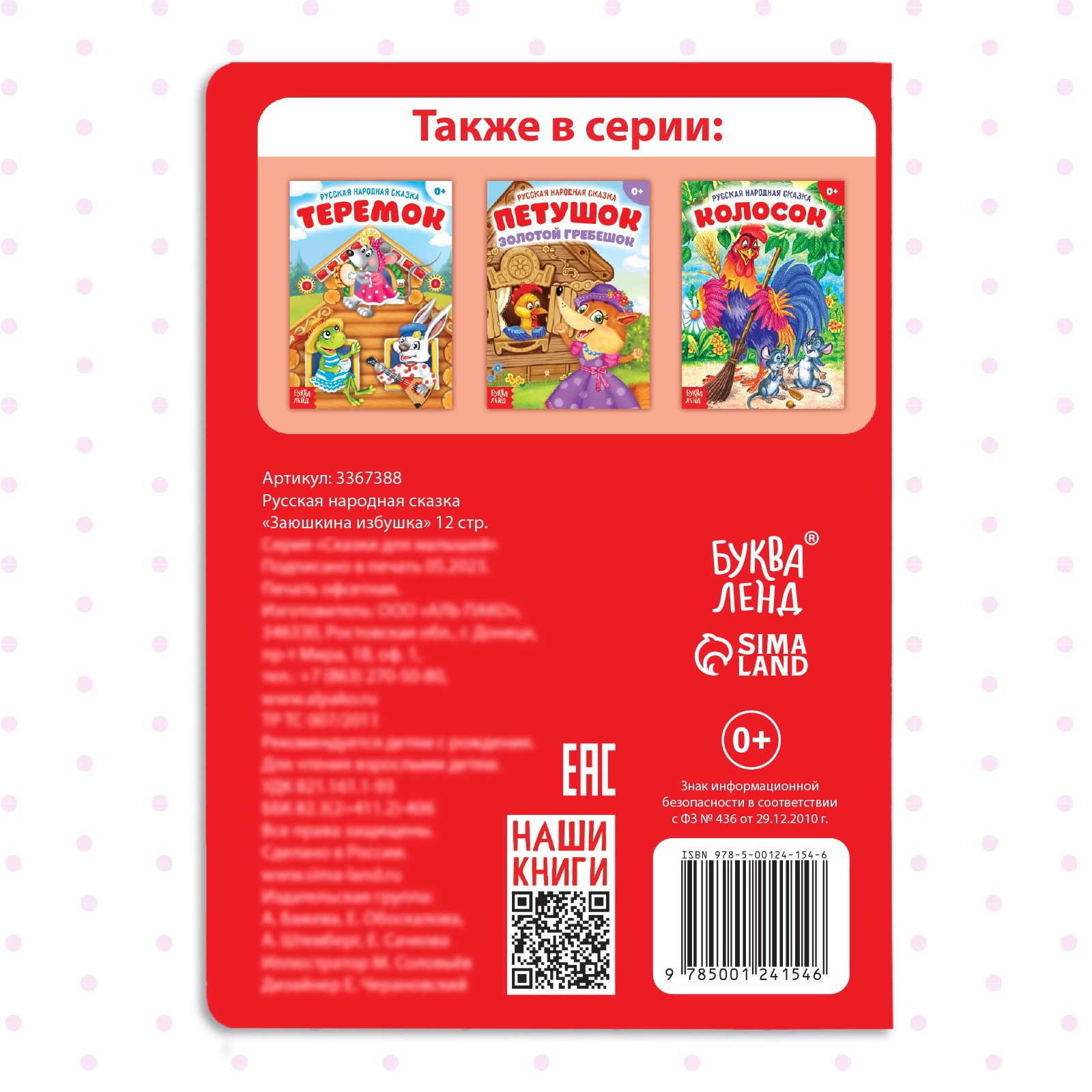 Возраст: Для детей, От 0 месяцев Размер упаковки: 0.4 x 15 x 10.5 см. Тип: Классическая Язык издания: Русский Автор: Народное творчество Год издания: 2021 Формат: А6+ tnved: 4903000000 Количество страниц: 12 Жанр: Сказка Набор: Нет Тип обложки: Мягкий переплёт Книги из серии "Мои первые сказки" знакомят малышей с добрыми поучительными историями. На примере поступков главных героев расскажите ребёнку, как поступать хорошо, а как плохо. У издания удобный формат: небольшую книгу малыш без труда удержит в руках. Страницы сделаны из плотного картона, поэтому сказка будет радовать вас и кроху ещё долгое время. Издание предназначено для чтения взрослыми детям с рождения. | ||