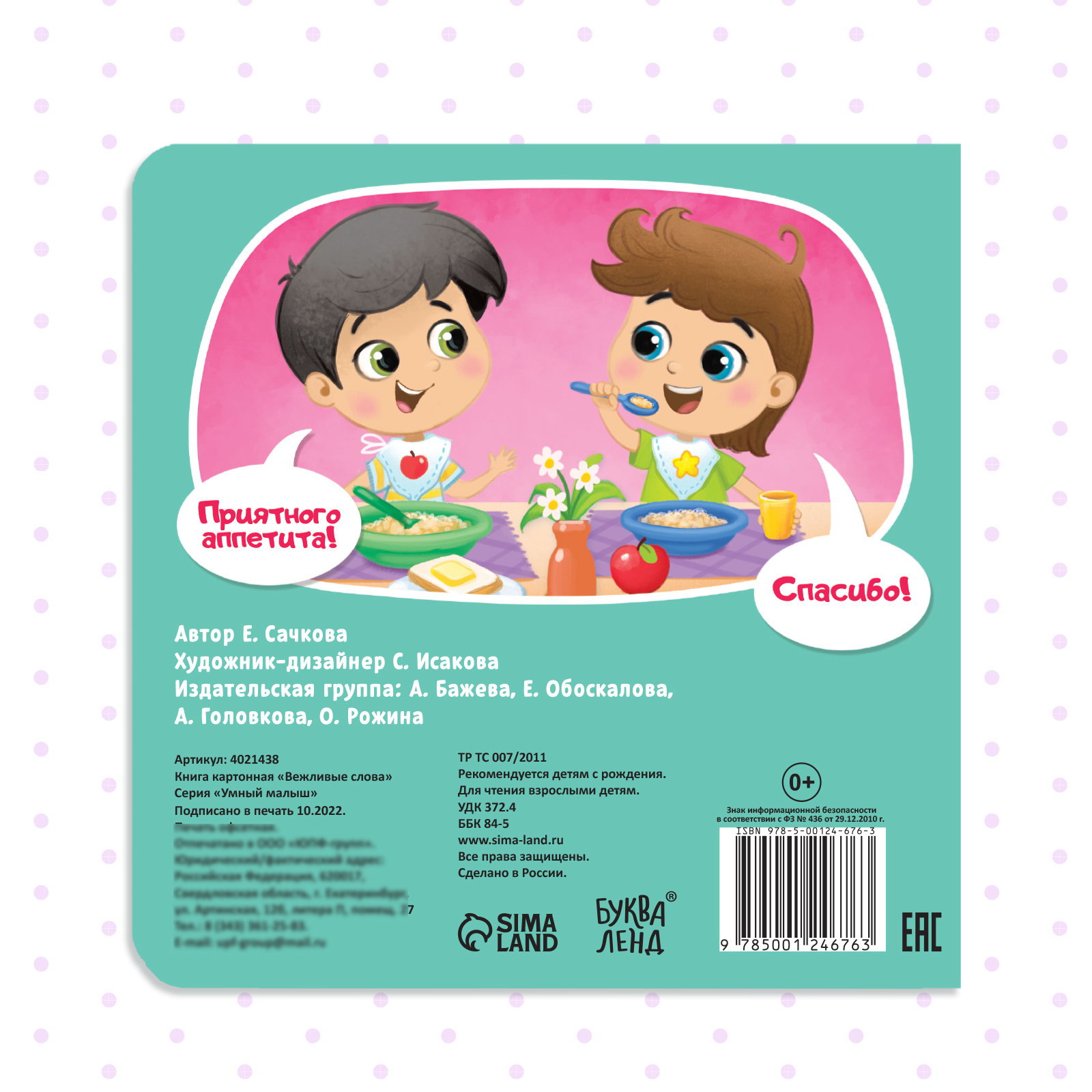 Возраст: Детский, Для детей, От 0 месяцев Размер упаковки: 15 x 0.3 x 15 см. Язык издания: Русский Формат: Квадрат Тип обложки: Твёрдый переплёт tnved: 4903000000 Температурное ограничение: Нет Количество страниц: 10 Тип: Классическая Набор: Нет Автор: Сачкова Евгения Камилевна Картонная книга "Вежливые слова" это обучающее пособие для малышей, которое помогает изучить важные фразы вежливости и ситуации их использования. Яркие иллюстрации привлекают внимание, а крепкий картон делает книгу удобной для маленьких ручек. Особенности и преимущества книги