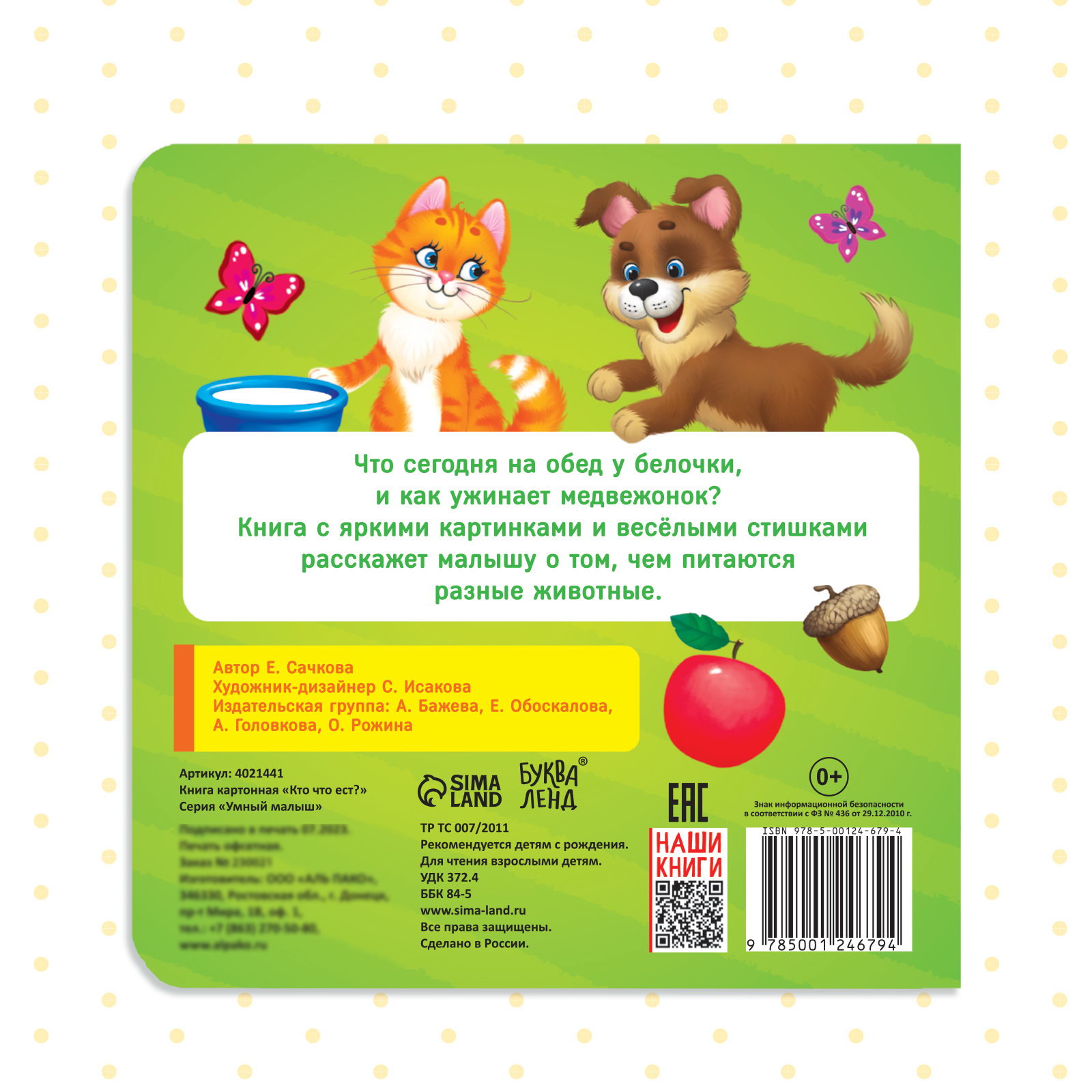 Картонная книга "Кто что ест", 10 стр., 0.4x15x15 см., БУКВА-ЛЕНД, Россия