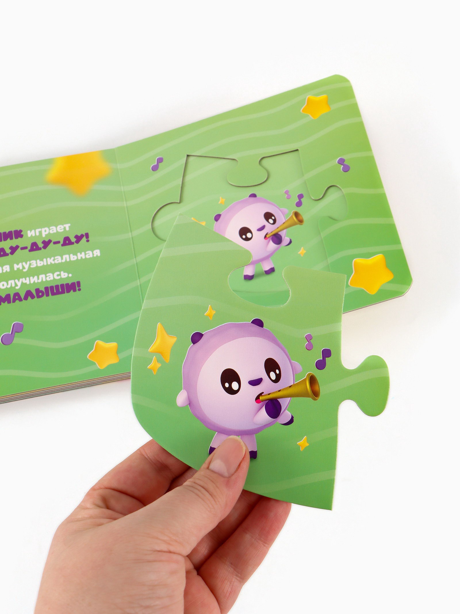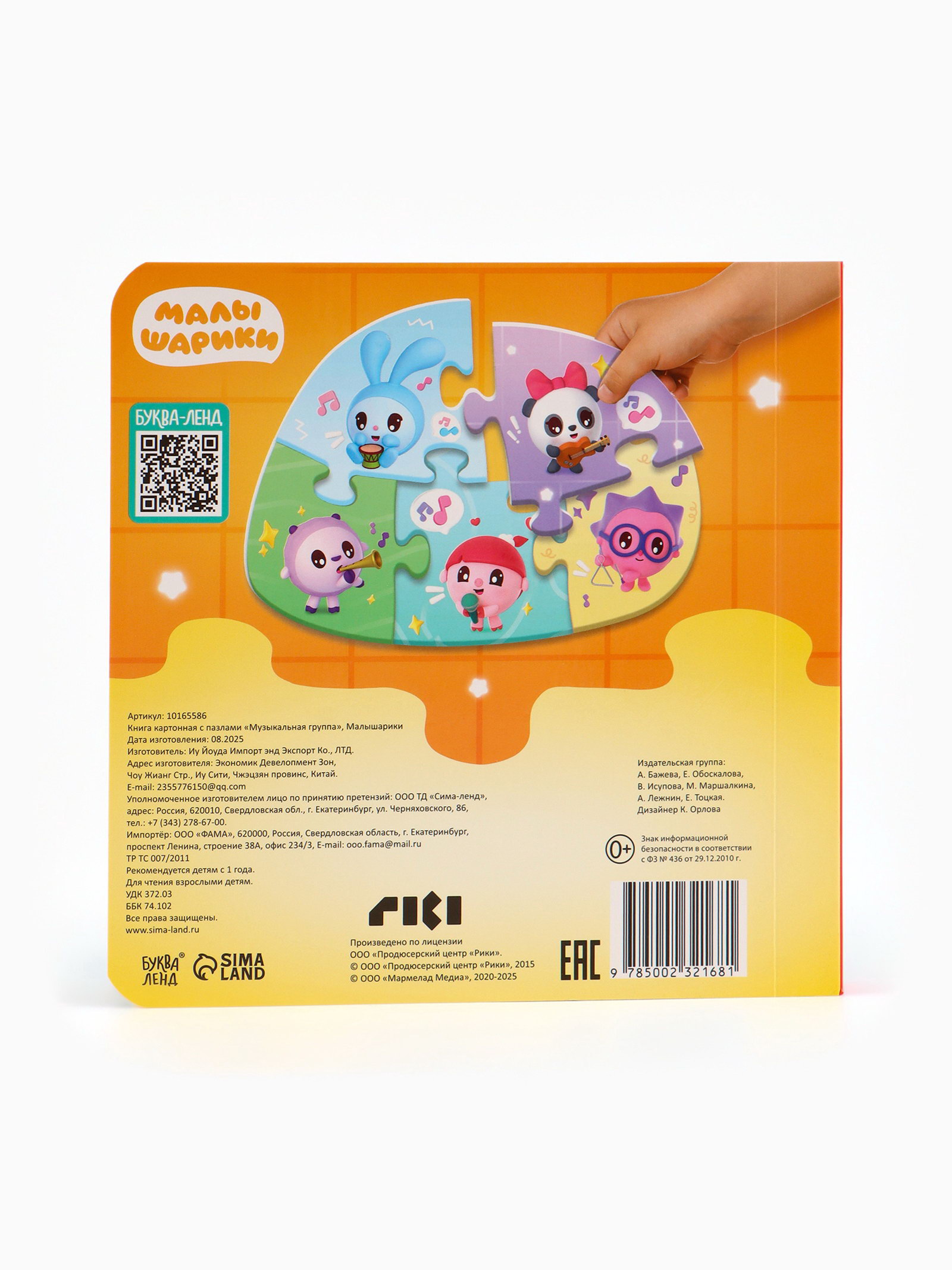 Размер упаковки: 16 x 16 x 1.5 см. tnved: 4903000000 Лицензия разработки: Да Количество страниц: 12 Температурное ограничение: Нет Язык издания: Русский Возраст: От 1 года Автор: Коллектив авторов Тип: С пазлами Год издания: 2025 Набор: Нет Формат: Квадрат Герои "Малышариков" собрались в музыкальную группу и приглашают малыша помочь им выступить! На каждой странице яркая сцена и вынимающиеся пазлы-детали, которые нужно правильно собрать. Это не просто книжка, а первая игра на логику и внимание с любимыми персонажами. Чем полезна эта книжка-пазл.