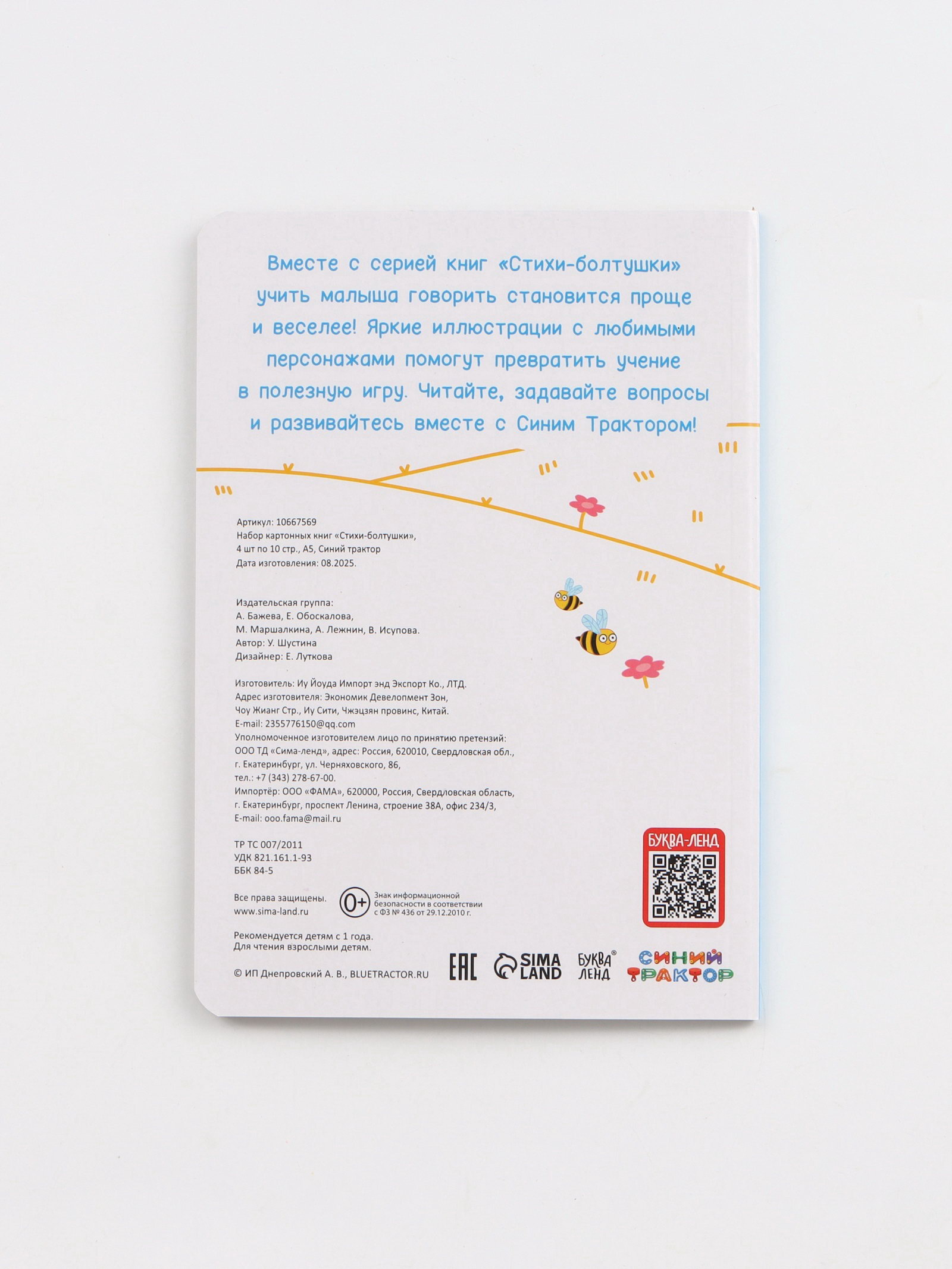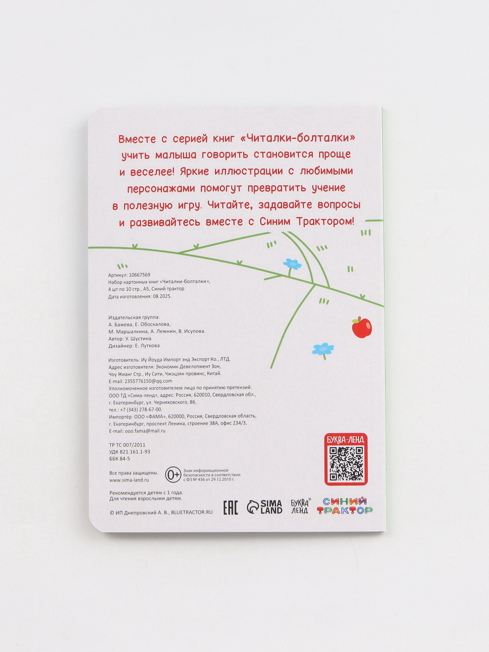 Размер упаковки: 15 x 1.7 x 21.5 см. tnved: 4903000000 Лицензия разработки: Да Количество страниц: 10 Год издания: 2025 Возраст: От 1 года Язык издания: Русский Тип: Классическая Набор: Да Автор: Шустина Ульяна Владимировна Формат: А5+ Вид: Обучающие книги Тип обложки: Твёрдый переплёт Жанр: Стихи Познакомьте малыша с весёлыми стишками и добрыми героями ! Этот набор создан для того, чтобы читать вслух, смеяться, повторять строчки и вместе мечтать о приключениях синего трактора и его друзей. Картонные страницы выдержат даже самые активные детские ручки от первых дней знакомства с книгой до уверенного листания "сам". Почему родители выбирают этот набор:
