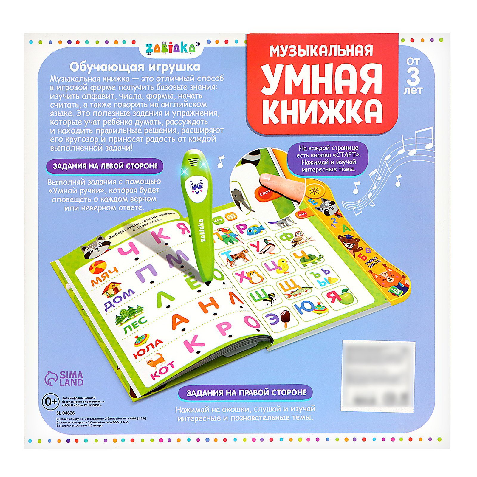 Развитие навыков: Буквы, цифры, Внимание, Грамматика, Кругозор, Логика, Моторика, Память, Счёт, Фигуры, цвета, Чтение Тема обучения: Буквы, слова, русский язык, Иностранные языки, Окружающий мир, Развитие логики/мышления, Развитие моторики, Развитие памяти, Цвета, формы, звуки, Цифры, счёт, математика Размер упаковки: 26.5 x 3 x 26.5 см. Игрушка с видео: Да Автор: Нет автора Количество страниц: 20 tnved: 9503007000 Русская озвучка: Да Количество батареек: 5 Батарейки в комплекте: Нет Дополнительные функции: Звуковые эффекты Возраст: От 3 лет Типоразмер батареек: AAA (LR03) Вид: Книжка Для кого: Унисекс Музыкальная книжка поспособствует развитию внимания, мышления, памяти, слухового, зрительного восприятия и мелкой моторики рук. С интерактивной игрушкой ребёнок получит базовые знания: изучит алфавит, числа, формы, начнёт считать, а также повторять слова на английском языке. В книге вы найдёте полезные задания и упражнения, которые учат ребёнка рассуждать и находить правильные решения, расширяют его кругозор и приносят радость от каждой выполненной задачи. На каждой странице есть кнопка "СТАРТ". Нажимайте и изучайте интересные темы вместе с малышом. Задания на левой стороне: Выполняйте задания с помощью "Умной ручки", которая будет оповещать о каждом верном или неверном ответе. Задания на правой стороне: Нажимайте на окошки, слушайте и изучайте интересные и познавательные темы. | ||