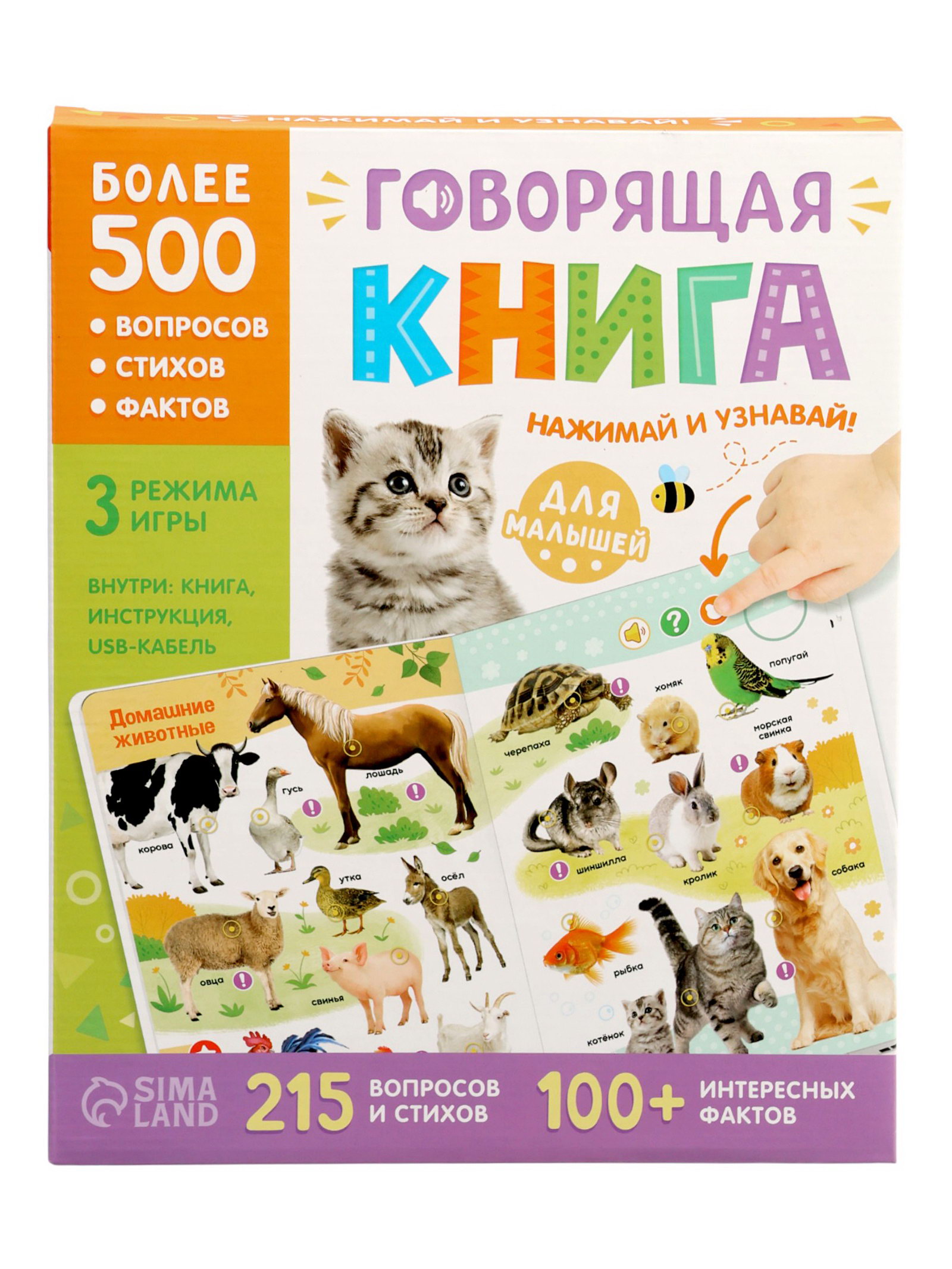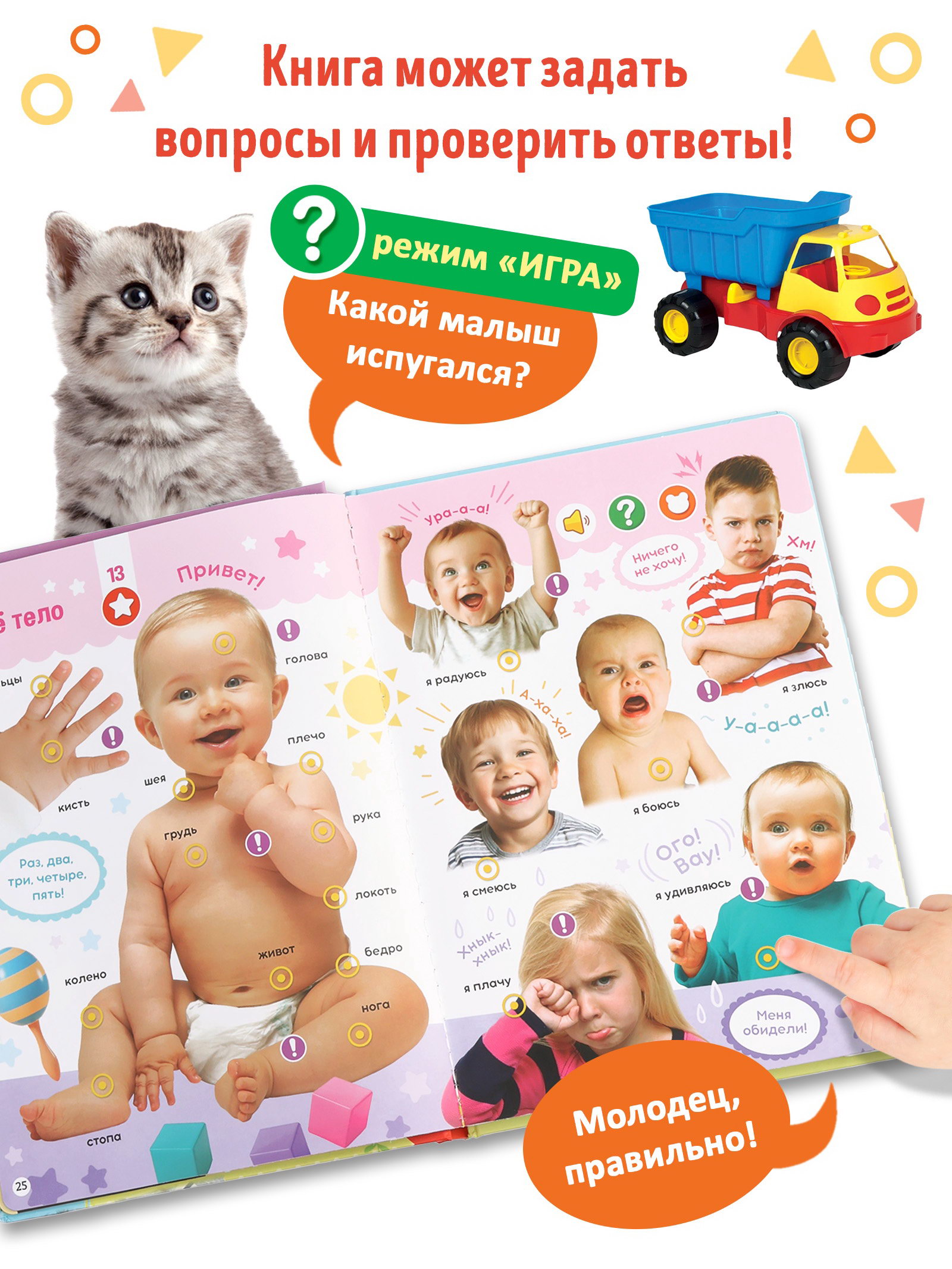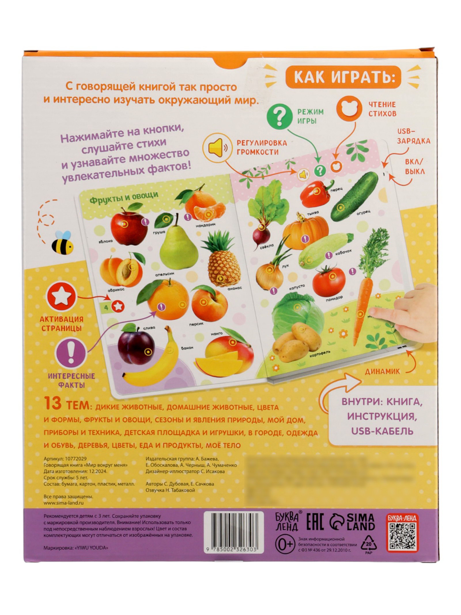 Размер упаковки: 2.5 x 27.5 x 22.5 см. tnved: 4903000000 Возраст: От 3 лет Тема обучения: Окружающий мир Язык издания: Русский Автор: Коллектив авторов Формат: А4- Набор: Нет Количество страниц: 26 Год издания: 2024 Говорящая книга "Мир вокруг меня" это первый шаг малыша в большой мир, где всё можно потрогать, услышать и понять. Нажал на картинку и зазвучал голос: "Это корова! Она говорит "мууу"". Так ребёнок не просто смотрит на животных, транспорт или фрукты он слышит их, повторяет за ними и учится говорить сам. Каждая страница интерактивное занятие: знакомство с животными, фруктами , временами года. Книга отвечает на вопросы, задаёт свои и хвалит за правильные ответы. Это не просто чтение это диалог, в котором малыш чувствует себя важным участником. Почему родители выбирают говорящую книгу: