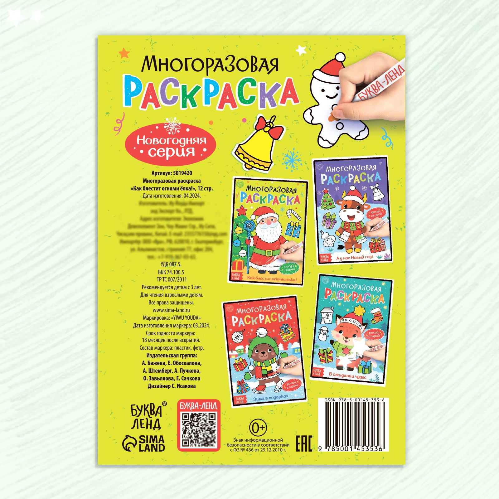Раскраска многоразовая "Как блестит огнями ёлка!", 12 стр., с маркерами, 0.5x25x21 см., БУКВА-ЛЕНД, Китай