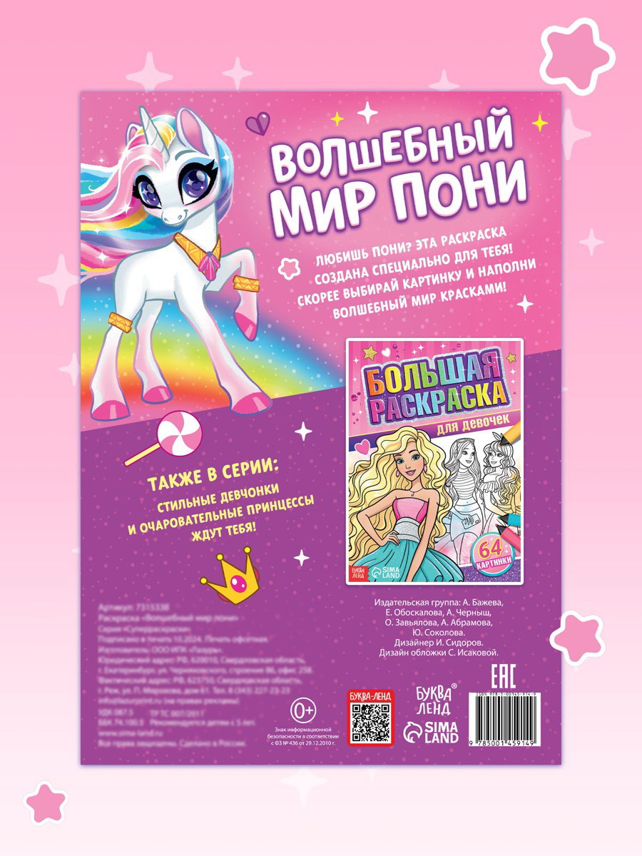 Раскраска "Волшебный мир пони", 68 стр., формат А4, 0.5x21x29.5 см., БУКВА-ЛЕНД, Россия