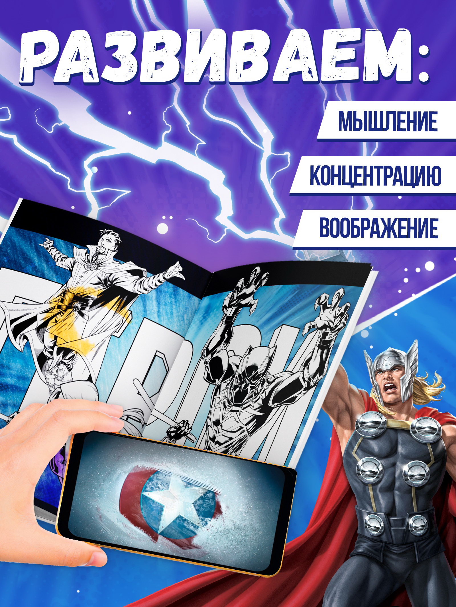 Супергеройская раскраска с дополненной реальностью, 19 анимаций, 14.8x0.3x21 см., MARVEL, Китай