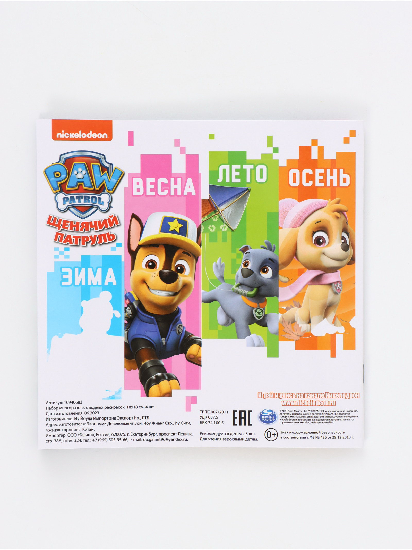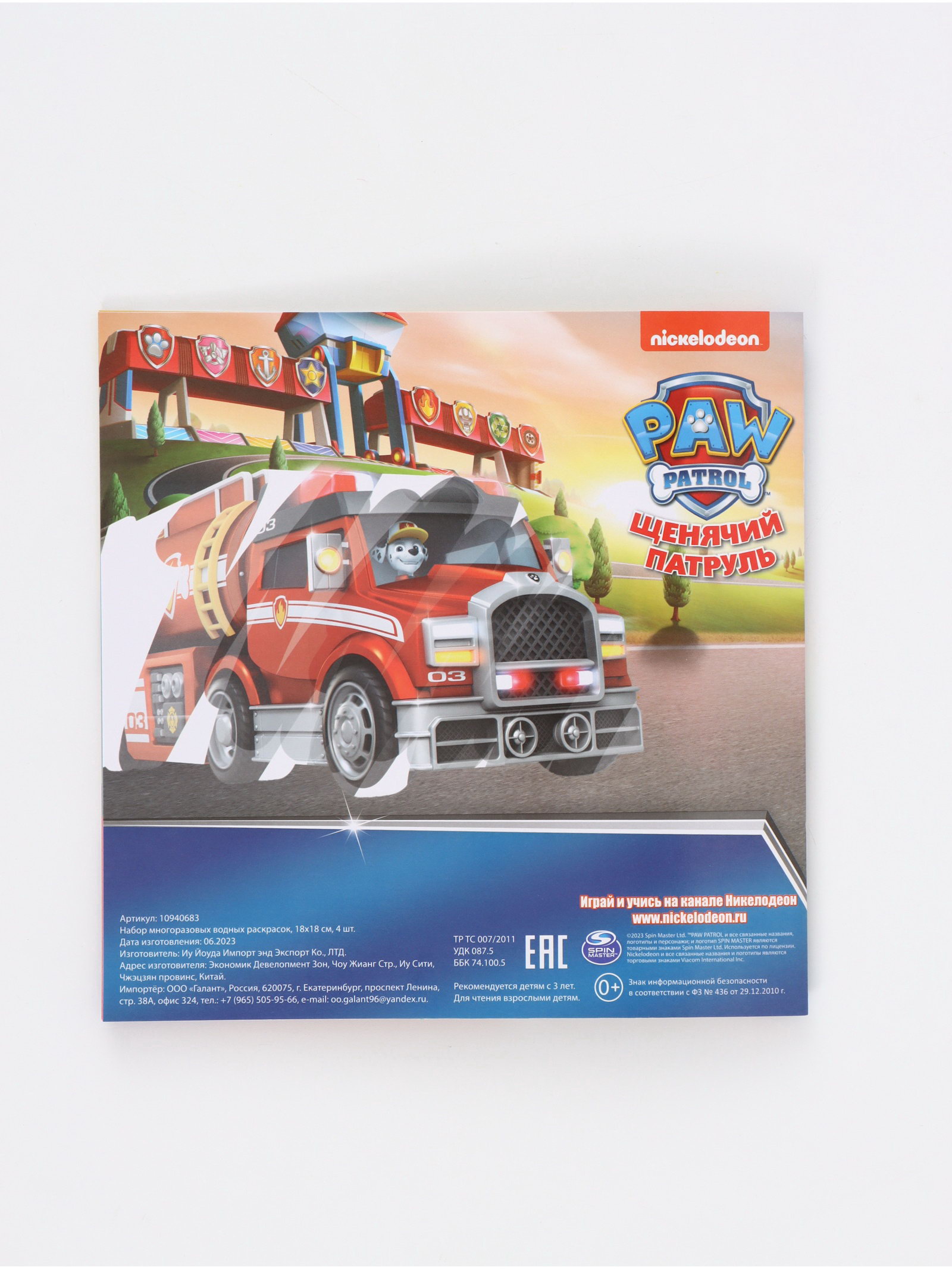 Набор многоразовых водных раскрасок, 18x18 см, 4 шт., Щенячий патруль, 18x0.2x18 см., Paw Patrol, Китай