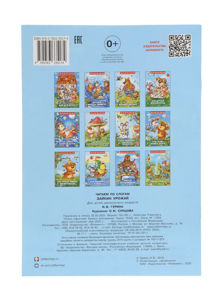 Тема обучения: Литература, Развитие речи Размер упаковки: 0.1 x 23.5 x 16.5 см. tnved: 4901990000 Температурное ограничение: Нет Возраст: От 3 лет Автор: Народное творчество Год издания: 2025 Тип обложки: Мягкий переплёт Формат: А5+ Язык издания: Русский Жанр: Сказка Количество страниц: 16 Набор: Нет Книга "Зайкин урожай: Читаем по слогам" это добрая история о трудолюбии, которая поможет малышам освоить навыки чтения. 16 страниц с яркими иллюстрациями и текстами, разделёнными на слоги, делают процесс обучения лёгким и увлекательным. Что делает эту книгу особенной