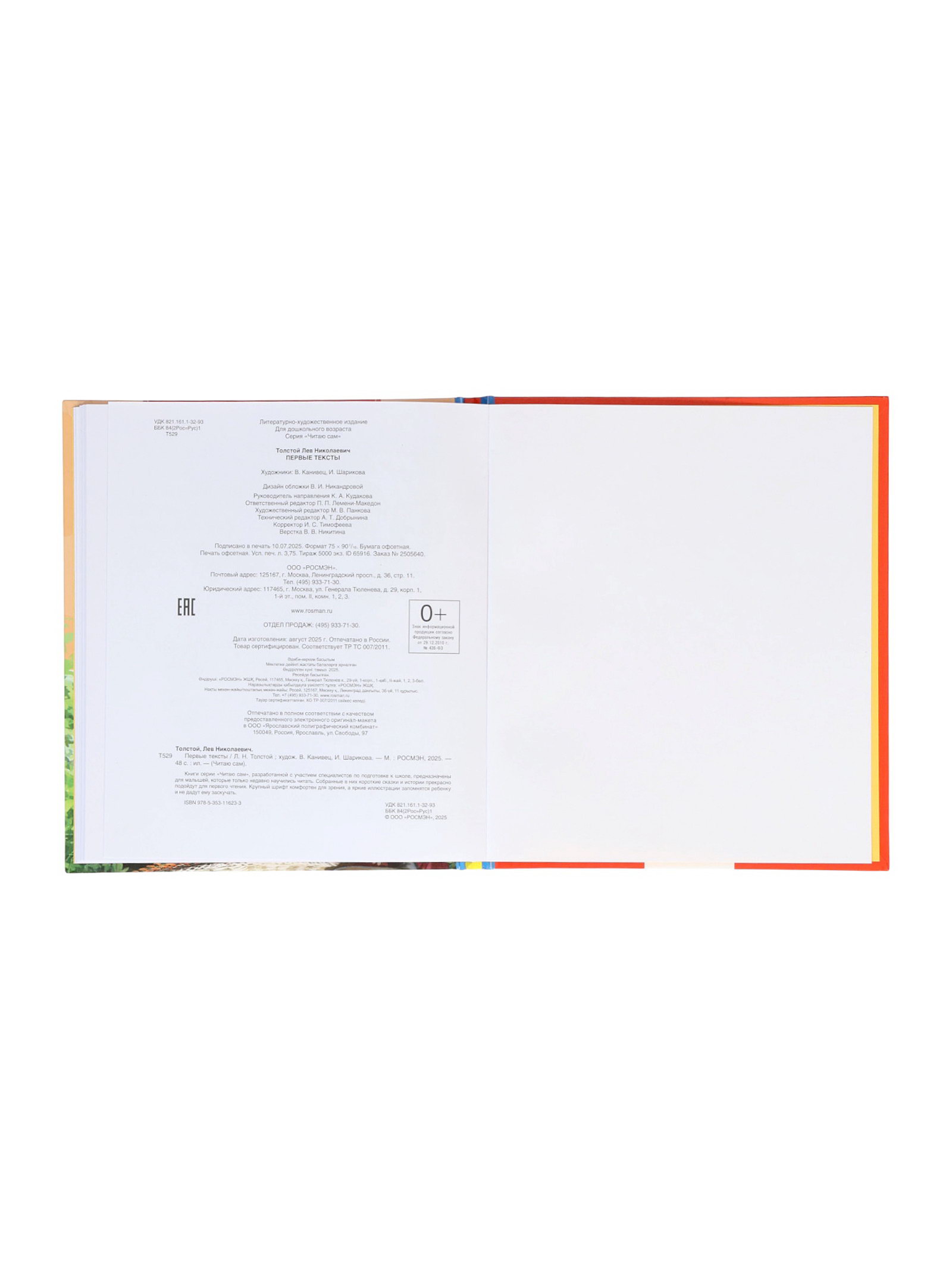 Тема обучения: Буквы, слова, русский язык, Литература Размер упаковки: 19 x 1 x 22 см. tnved: 4901990000 Температурное ограничение: Нет Формат: А5+ Набор: Нет Возраст: От 3 лет Тип обложки: Твёрдый переплёт Язык издания: Русский Количество страниц: 48 Жанр: Сказка Автор: Толстой Лев Николаевич Книга "Первые тексты. По слогам" это увлекательный сборник коротких сказок и историй для детей от 3 лет, созданный Львом Толстым. Твёрдый переплёт и удобный формат делают её надёжным помощником в обучении чтению. Особенности