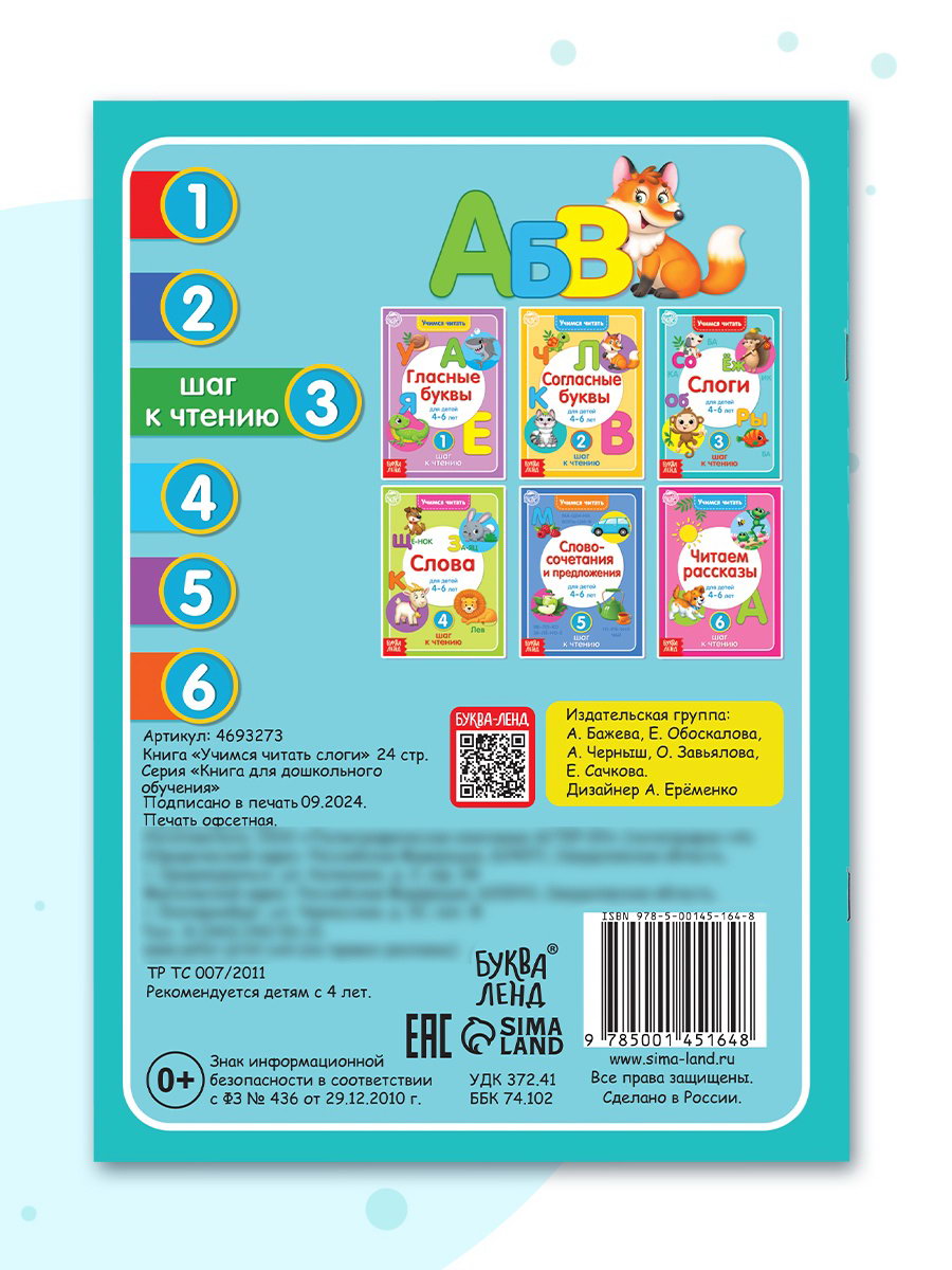 Возраст: Для детей, От 4 лет Тематика: Подготовка к школе, Чтение Размер упаковки: 0.1 x 17 x 12 см. Игрушка с видео: Да Язык издания: Русский Формат: А6+ Формат: А6+ tnved: 4903000000 Температурное ограничение: Нет Тема обучения: Буквы, слова, русский язык Школьный предмет: Буквы и чтение Вид: Обучающие книги Количество страниц: 24 Набор: Нет Тип обложки: Мягкий переплёт Автор: Сачкова Евгения Камилевна Год издания: 2019 Серия книг "Учимся читать" это обучающие пособия с яркими иллюстрациями и интересными заданиями. Они помогут родителям поэтапно обучить малышей чтению. В серии 6 книг: