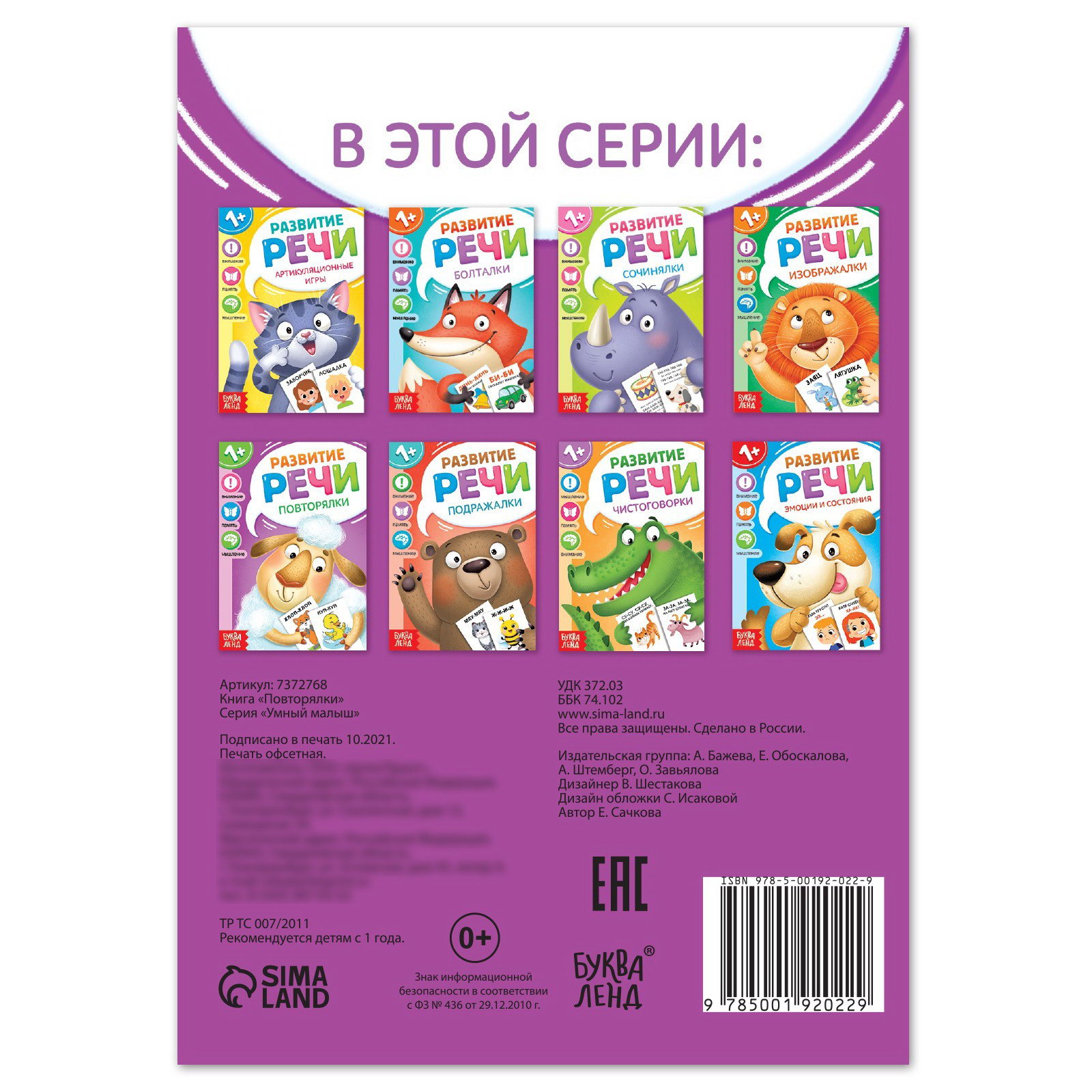 Возраст: Для детей, От 1 года Размер упаковки: 12 x 0.2 x 17 см. Язык издания: Русский Формат: А6+ Формат: А6+ tnved: 4903000000 Температурное ограничение: Нет Год издания: 2021 Количество страниц: 20 Набор: Нет Вид: Обучающие книги Тип обложки: Мягкий переплёт Тема обучения: Буквы, слова, русский язык Автор: Сачкова Евгения Камилевна Тематика: Для самых маленьких 0-3 лет Книга поможет потренировать произношение звуков и научиться говорить чётко и правильно. Повторяйте простые действия с картинок вместе с ребёнком и проговаривайте короткие слова, которые ассоциируются с этими действиями. Так, совмещая двигательную активность и речь, малыш быстрее освоит произношение даже сложных звуков. Подходит для занятий с детьми старше 1 года. | ||