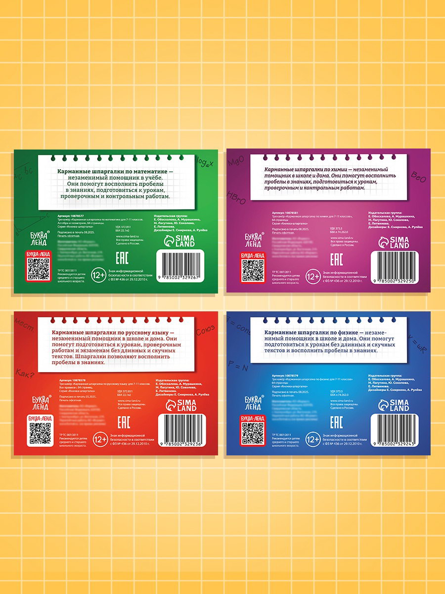Тема обучения: Буквы, слова, русский язык, Физика, Химия, Цифры, счёт, математика Размер упаковки: 13 x 1.8 x 19 см. tnved: 4903000000 Возраст: От 13 лет Количество страниц: 64 Набор: Да Формат: А5- Язык издания: Русский Автор: Коллектив авторов Год издания: 2025 "Карманные шпаргалки для 7–11 класса" это 4 книги, в которых самое важное собрано так, чтобы понять, запомнить и найти за 10 секунд. Математика, русский язык, физика, химия никакой воды, только суть, схемы и рабочие формулы, которые реально пригодятся на уроке, контрольной или ЕГЭ. Почему старшеклассники оставляют их в рюкзаке надолго: