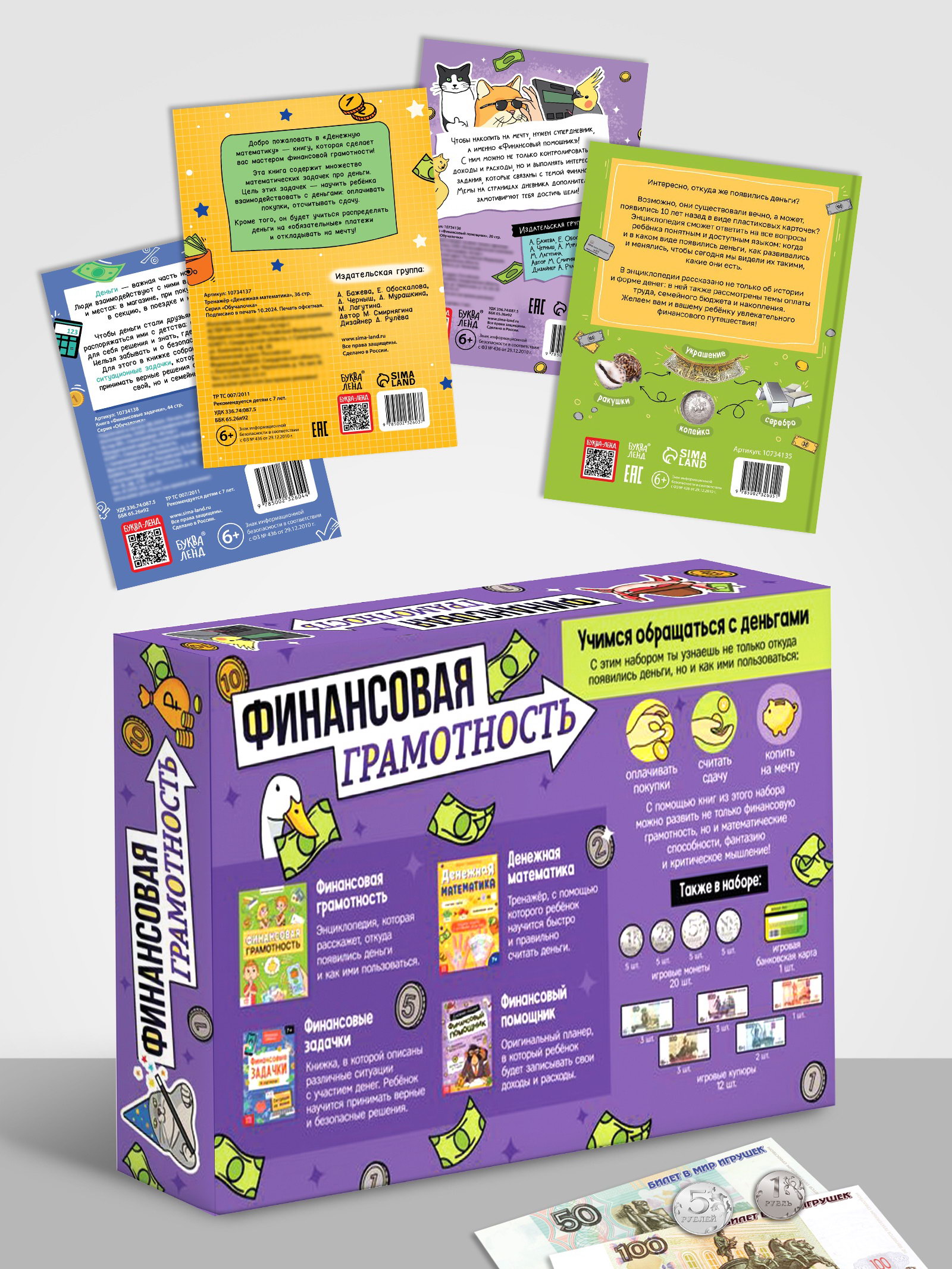 Количество страниц: 20, 36, 44, 48 Тип обложки: Мягкий переплёт, Твёрдый переплёт Размер упаковки: 19.5 x 5 x 26 см. tnved: 4903000000 Автор: Смирнягина Мария Олеговна Набор: Да Возраст: От 7 лет Язык издания: Русский Год издания: 2024 Вид: Обучающие книги Тема обучения: Финансовая грамотность Этот набор не про сложные термины и скучные расчёты. Это про то, как в игровой форме научить ребёнка понимать ценность денег, принимать разумные решения и мечтать с умом. В четырёх книгах истории, задания и практические советы, которые помогают детям от 7 лет освоить базовые финансовые навыки: от различия "хочу" и "нужно" до планирования личного бюджета и первого опыта сбережений. Почему родители выбирают этот набор: