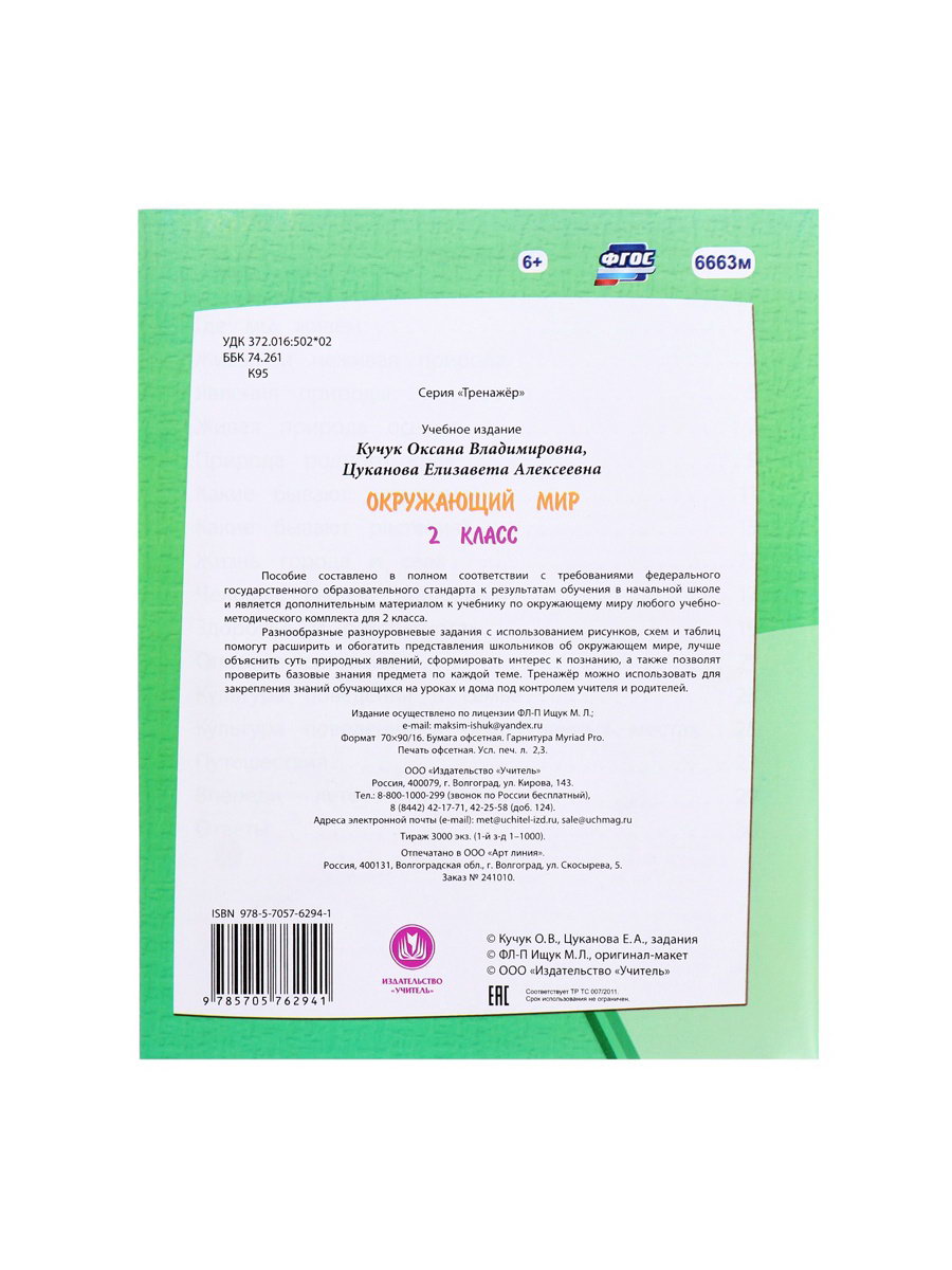 Размер упаковки: 16.5 x 0.3 x 20.5 см. Температурное ограничение: Нет Набор: Нет Вид: Обучающие книги Тематика: Подготовка к школе Тип обложки: Мягкий переплёт Автор: Кучук Оксана Владимировна Количество страниц: 32 Школьный предмет: Окружающий мир Вид пособия: Тренажёры Для детей с ОВЗ: Нет Школьный класс: 2 Соответствие стандарту (ФГОС): Да Формат: А5 Формат: А5 tnved: 4901100000 Тренажёр "Окружающий мир для второго класса" это увлекательный инструмент, который поможет ребёнку глубже познакомиться с окружающим миром и закрепить знания по предмету. Автор Оксана Кучук создала пособие, соответствующее ФГОС, чтобы сделать обучение эффективным и интересным. Что внутри