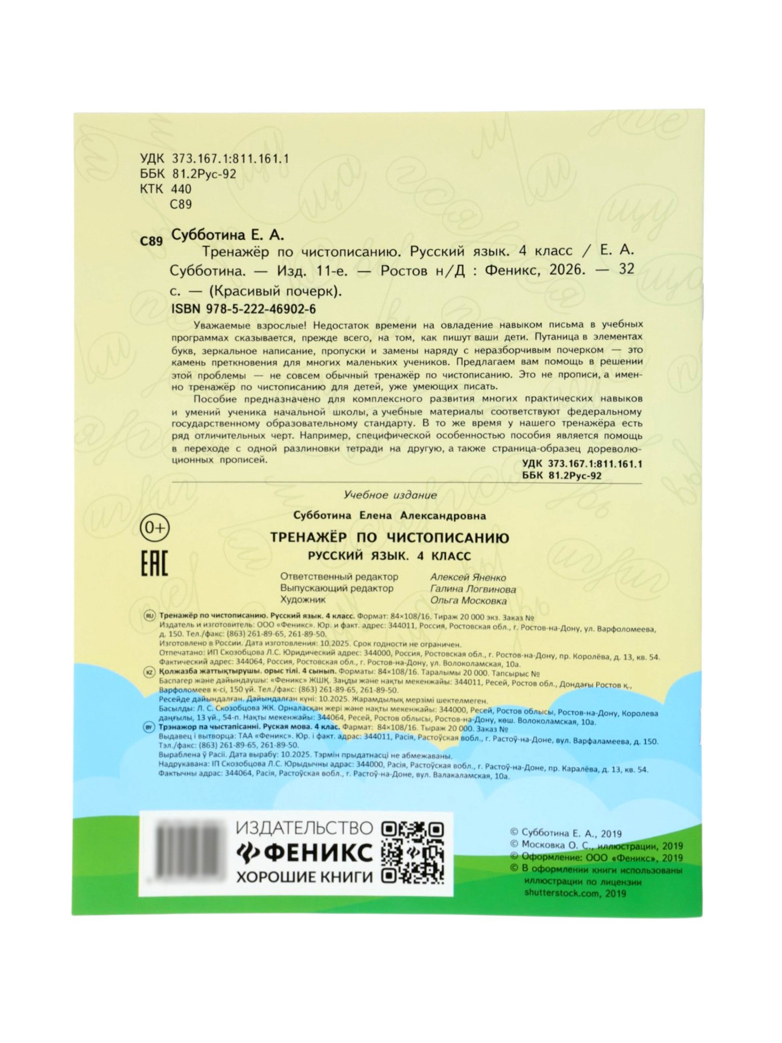 Тренажер по чистописанию "Русский язык", 4 класс, Субботина Е.А., 32 стр., Издательство «Феникс», Россия