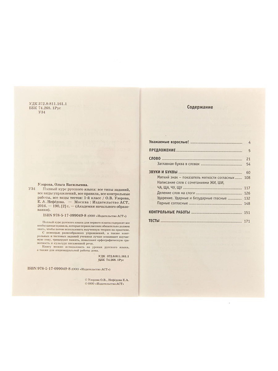 Автор: Нефедова Елена Алексеевна, Узорова Ольга Васильевна Возраст: Для детей, От 7 лет Размер упаковки: 12.5 x 20 x 1 см. tnved: 4903000000 tnved: 4903000000 Формат: А5- Язык издания: Русский Школьный предмет: Русский язык Тема обучения: Буквы, слова, русский язык Тип обложки: Мягкий переплёт Количество страниц: 190 Школьный класс: 1 Набор: Нет Год издания: 2022 Тетрадь "Полный курс русского языка для первоклассников" это надёжный помощник для освоения основ грамоты. Авторы Ольга Узорова и Елена Нефёдова создали пособие, которое содержит все необходимые правила и упражнения для успешного изучения русского языка в 1 классе. Особенности