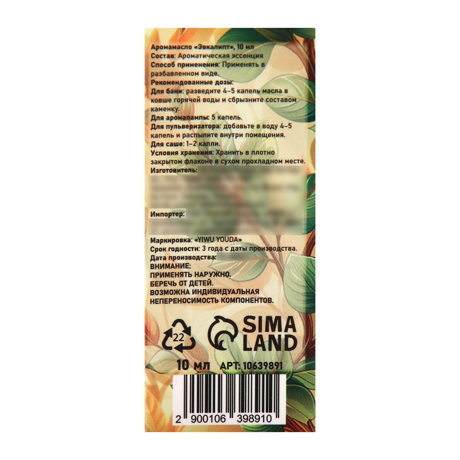 Аромамасло Эвкалипт 10 мл, 3x8x3 см., SB BEAUTY, Китай
