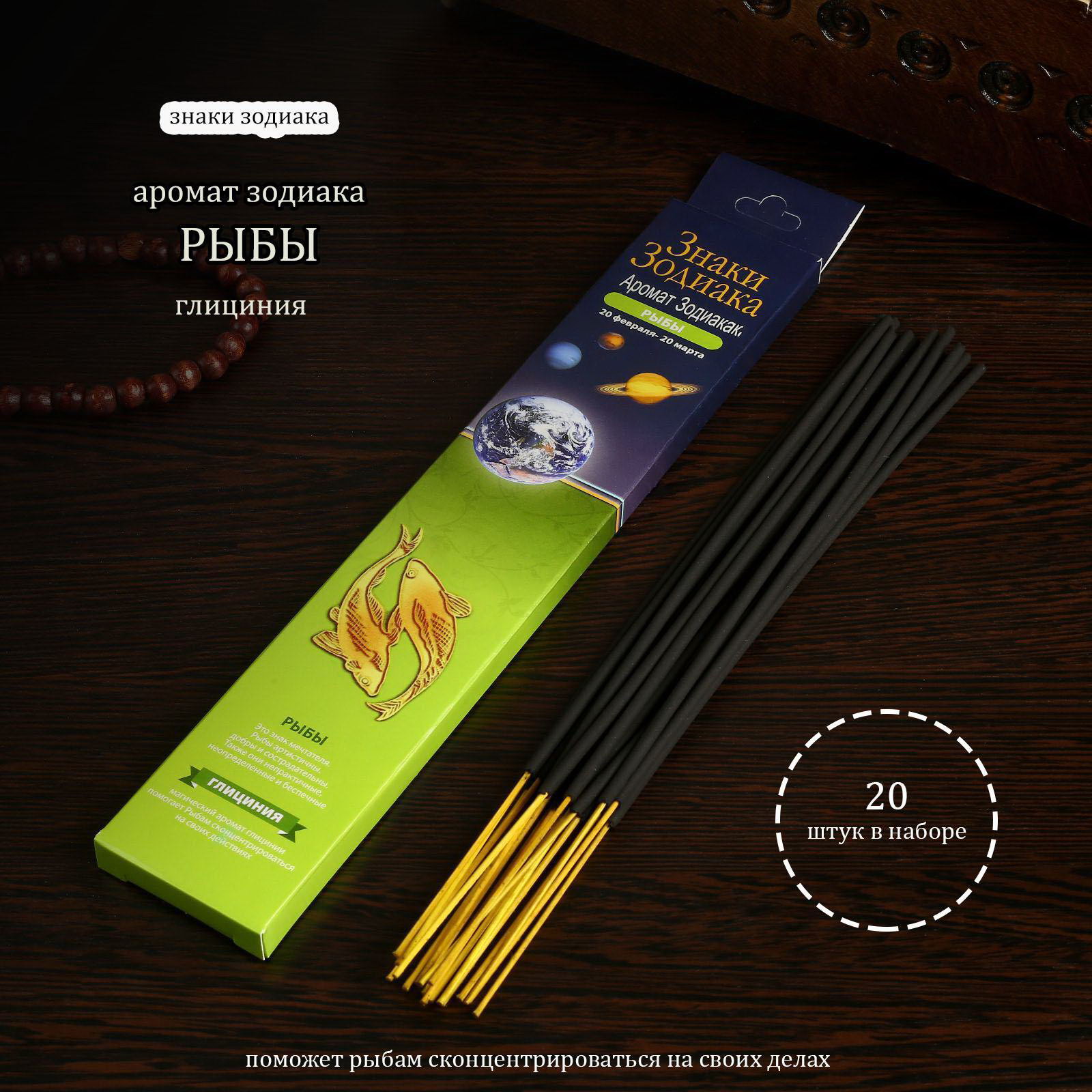 Благовония "Зодиак РЫБЫ–глициния", 20 палочек в упаковке, Индокитай, Россия