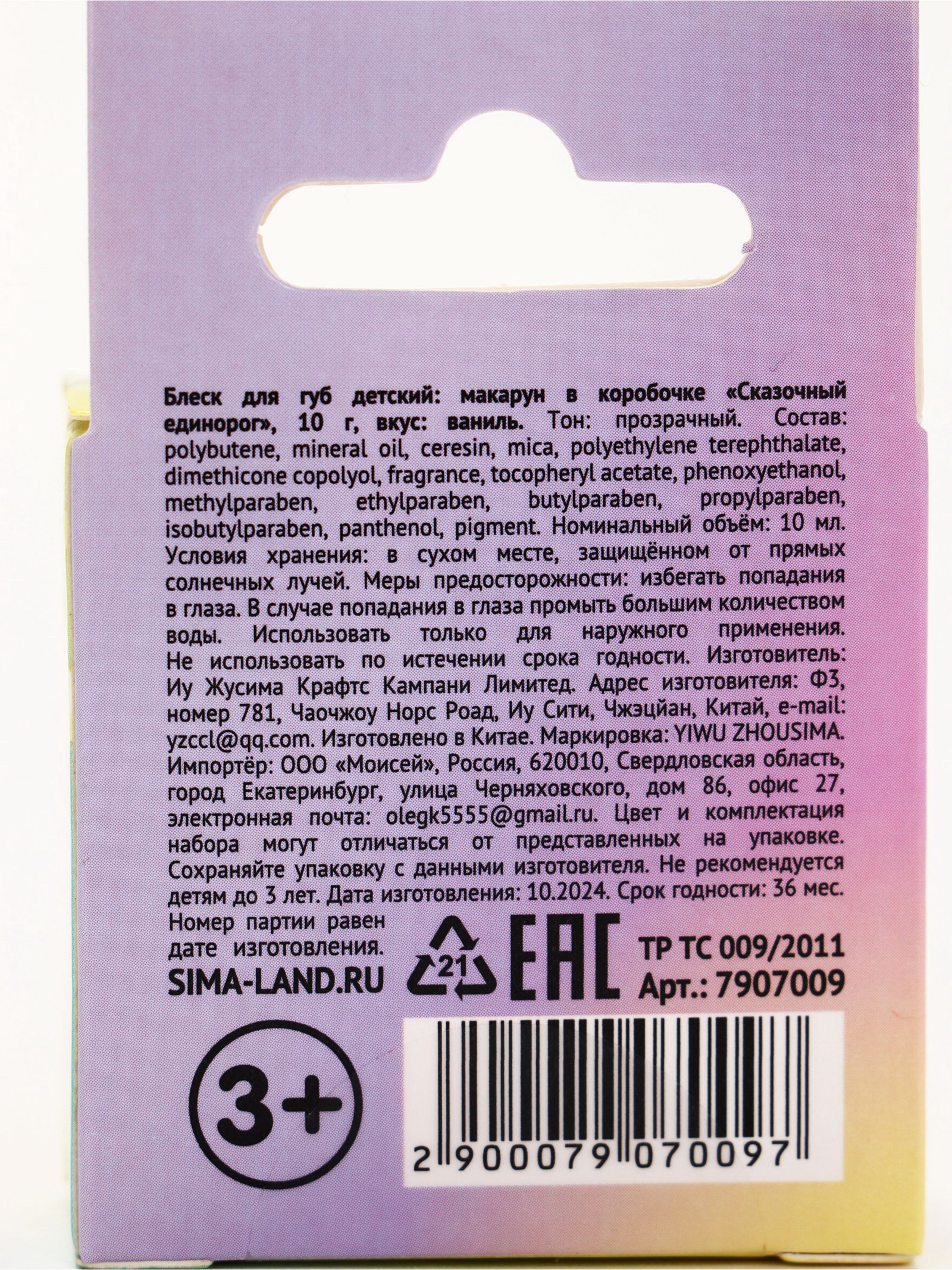 Блеск макарун в коробочке "Сказочный Единорог", 10 г, аромат ванили, 4.8x7.7x2.5 см., Выбражулька, Китай