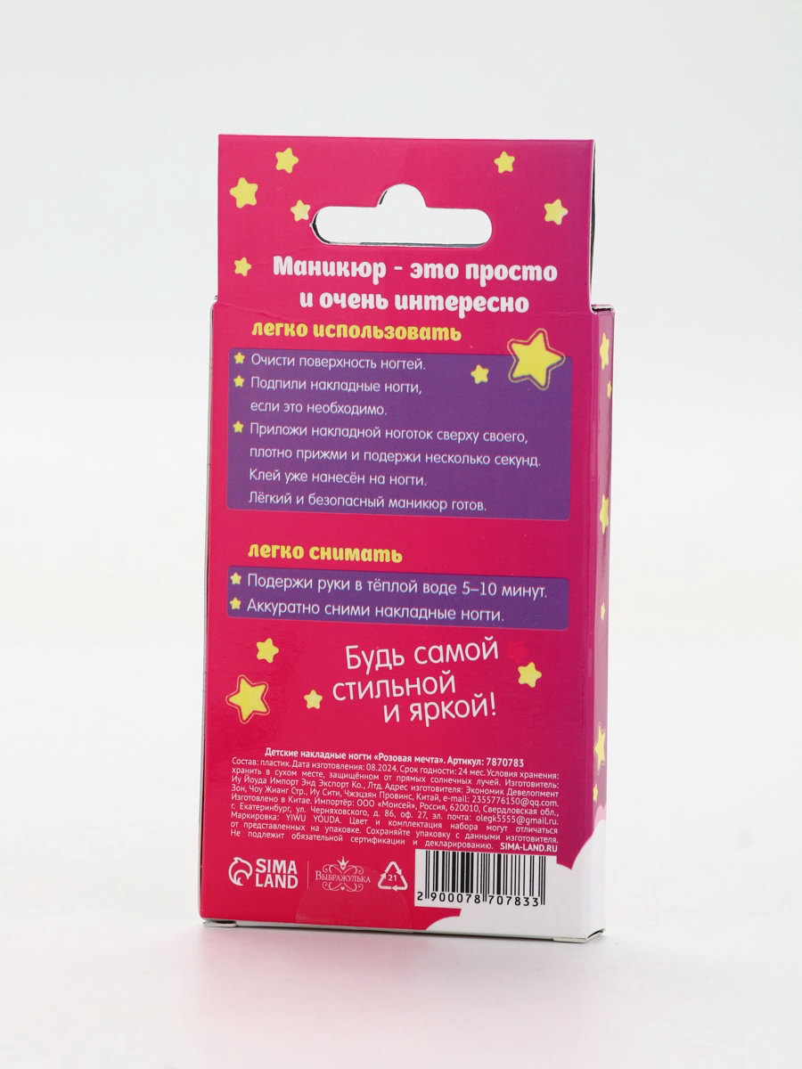 Детские накладные ногти "Розовая мечта", 12 шт., 6.7x10.5x1.2 см., Выбражулька, Китай