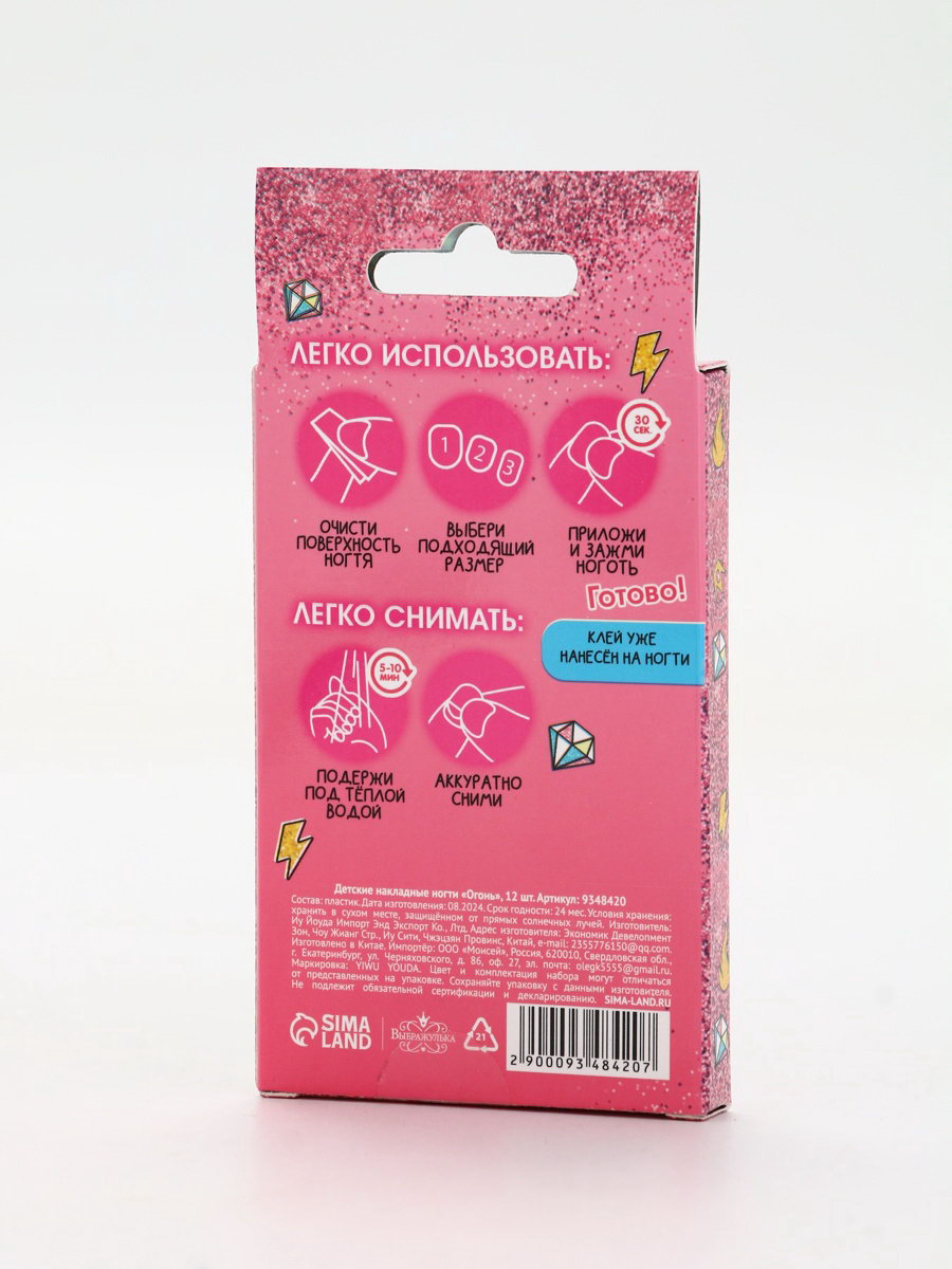 Детские накладные ногти "Огонь", 12 шт., 6.7x10.5x1.2 см., Выбражулька, Китай