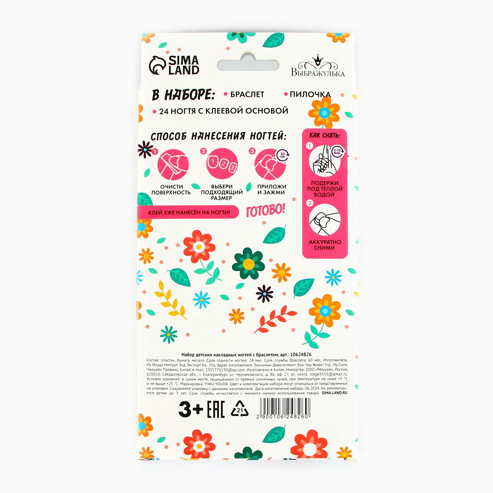 Детские накладные ногти "Весенний букет", 24 шт, набор с браслетом, 11x21x1.6 см., Выбражулька, Китай