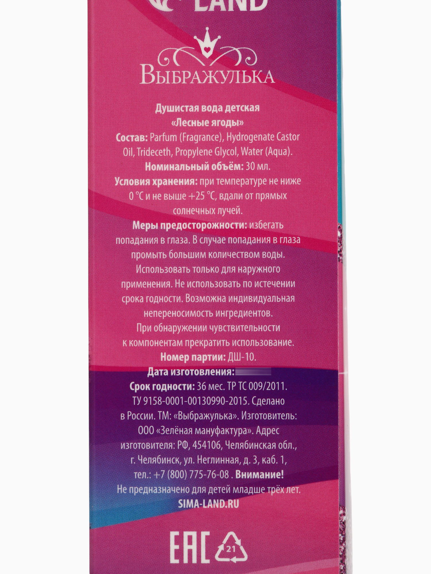 Размер упаковки: 4 x 12 x 4 см. Маркировка: Честный знак Для кого: Для девочки Вид дозатора: Распылитель tnved: 3303001000 Аромат: Лесные ягоды Вид: Парфюмерная вода Тематика праздника: Универсальная тематика Набор: Нет Адресат: Без адресата Возраст: Для детей Детская душистая вода подходит в качестве первого парфюма. Аромат сладкий, лёгкий и нежный, не слишком насыщенный как раз для маленькой леди. Пластиковый флакон с дозатором не разобьётся, если ребёнок его уронит. Объём флакона: 30 мл Безопасно для детей, не содержит спирта и красителей. | ||