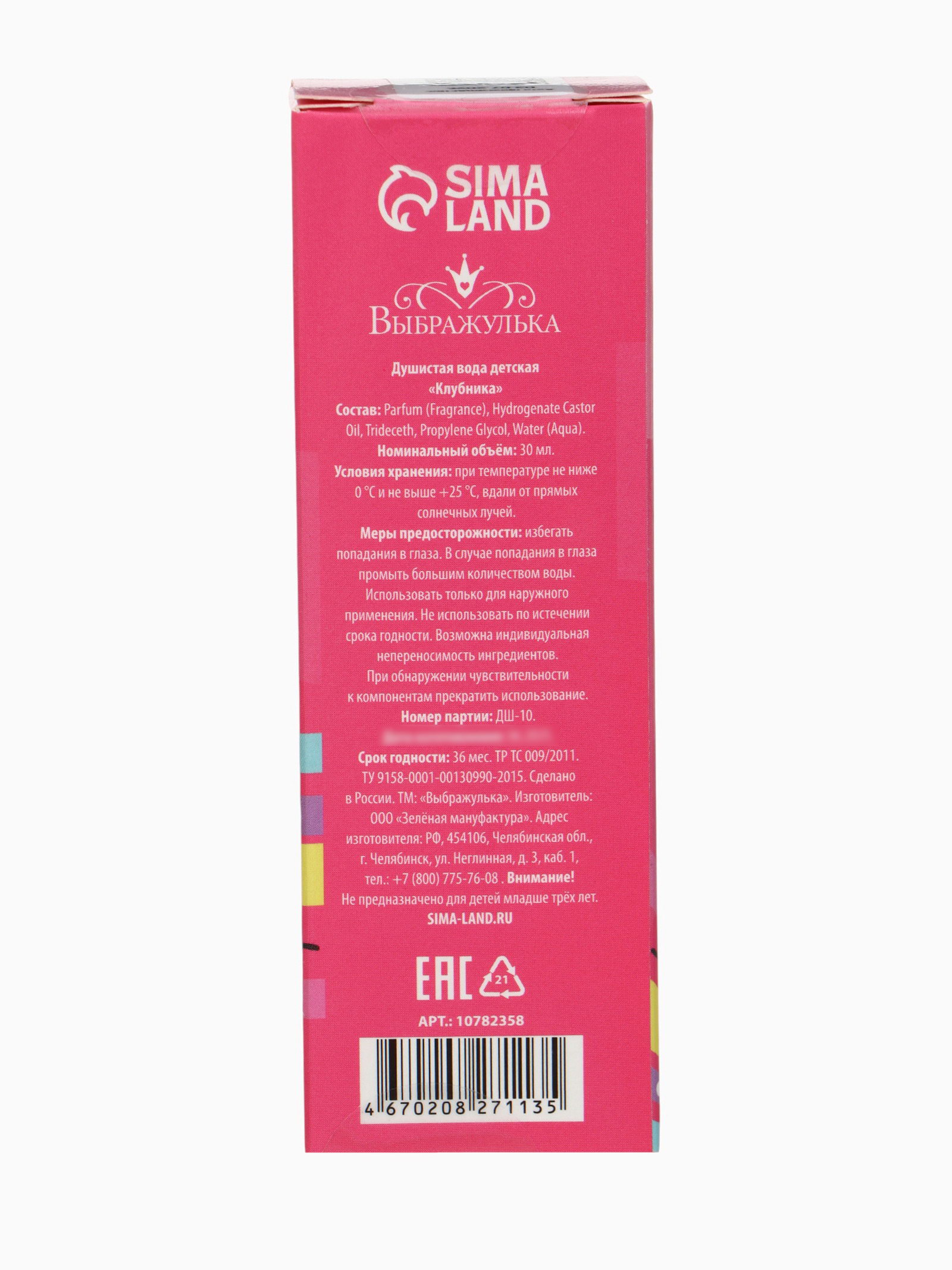 Размер упаковки: 4 x 12 x 4 см. Маркировка: Честный знак Вид дозатора: Распылитель Для кого: Для девочки tnved: 3303001000 Вид: Парфюмерная вода Аромат: Лесные ягоды Тематика праздника: Универсальная тематика Набор: Нет Возраст: Для детей Адресат: Без адресата Детская душистая вода подходит в качестве первого парфюма. Аромат сладкий, лёгкий и нежный, не слишком насыщенный как раз для маленькой леди. Пластиковый флакон с дозатором не разобьётся, если ребёнок его уронит. Объём флакона: 30 мл Безопасно для детей, не содержит спирта и красителей. | ||