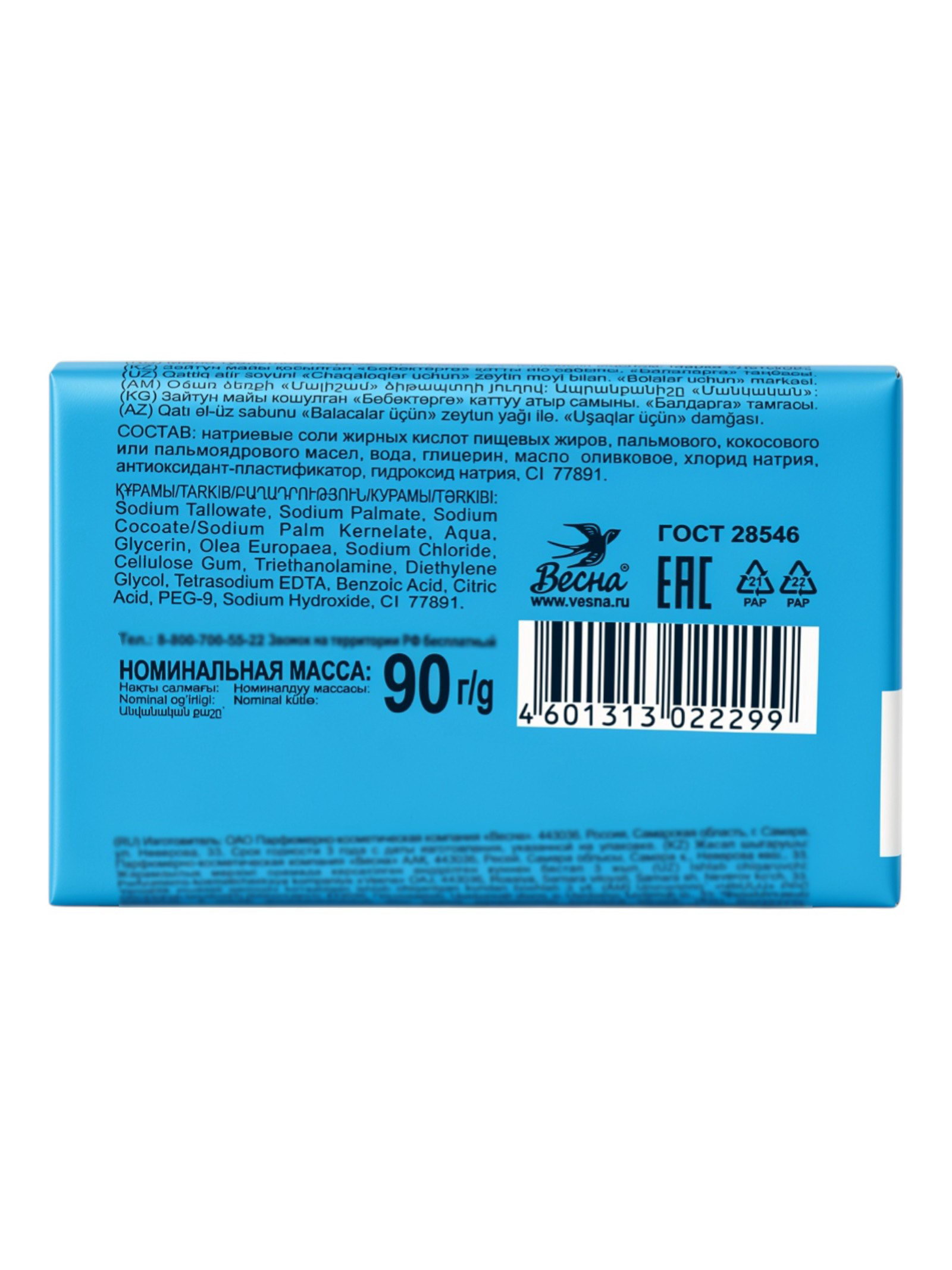 Мыло туалетное Малышам с оливковым маслом, 90 г, Весна, Россия