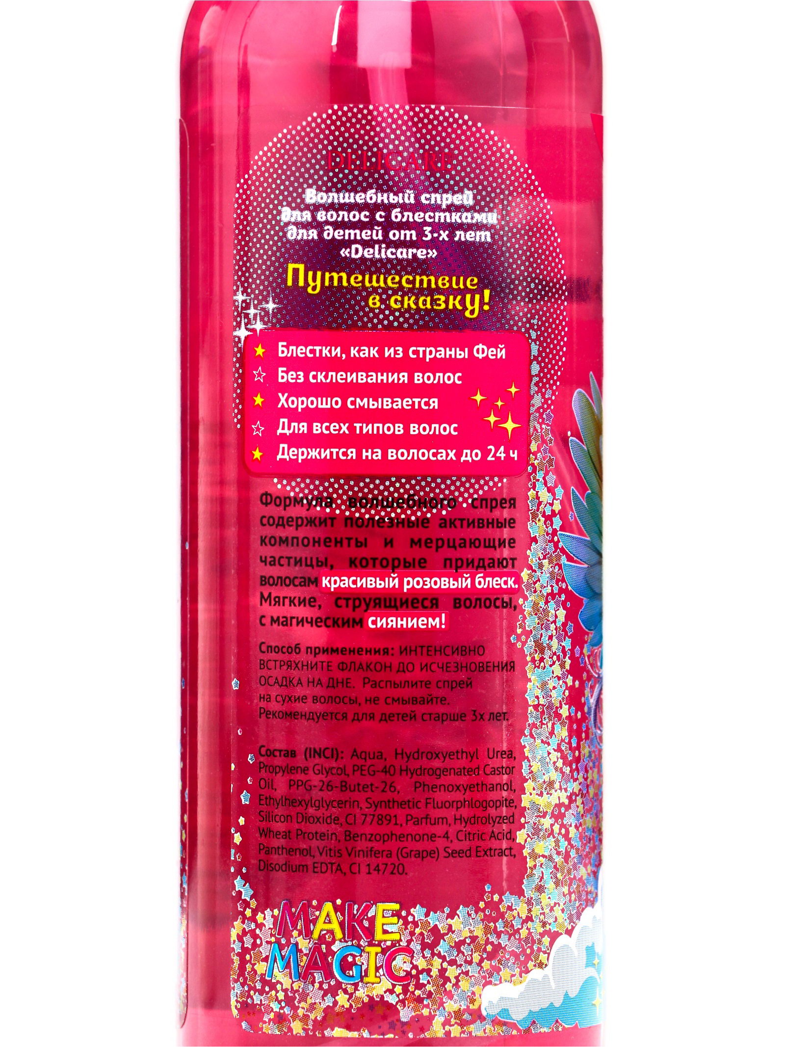 Размер упаковки: 4.5 x 17 x 4.5 см. tnved: 3304990000 Температурное ограничение: Нет Спрей для лёгкого расчёсывания Delicare "Сказочный Патруль" с блёстками – это яркое и эффективное средство для ухода за детскими волосами, которое не только облегчает процесс расчёсывания, но и добавляет волосам волшебное сияние.