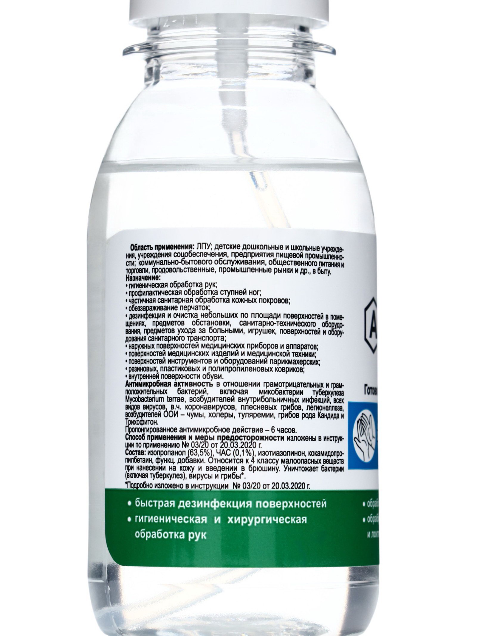Состав: В качестве действующих веществ содержит: изопропиловый спирт (2-пропанол) 63,5% и алкилдиметилбензиламмоний хлорид 0,1%, а также функциональные добавки. | ||